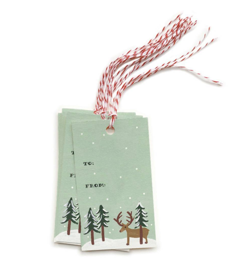 Click above to see festive ribbons, bags, and tags. (Jute twine 24-pack ($38), shopterrain.com, Cherrywood tape ($6.99), containerstore.com, Vintage Southwestern trim ($7), etsy.com/shop/earthgatherings2, Rudolph gift tags ($7 for a package of 10), riflepaperco.com)