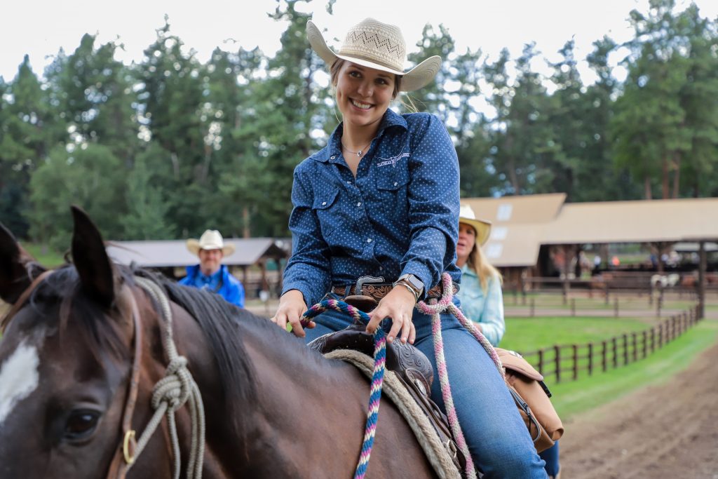 Shelah came to the lodge with her grown son and daughter and their kids. They’re all first-timers. “My daughter has been a dedicated rider all her life and my 10-year-old granddaughter is just like her, so they’ve been out riding every day, every chance they get,” she says. “My son and his boys aren’t interested in riding. They’ll get on a horse before the week is out, but they’ve been out swimming and on bikes and white-water rafting and all that.”
