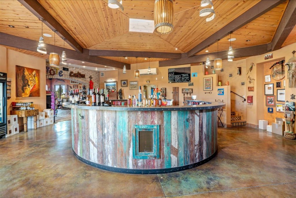 The vineyard produces seven varietals including Zinfandel, Petite Syrah, and Cabernet Sauvignon, and the winery and distillery produces nearly 3,000 cases each year. Part of the property also includes a Southwestern-themed cantina and tasting room complete with a bar, table seating, and a commercial kitchen.