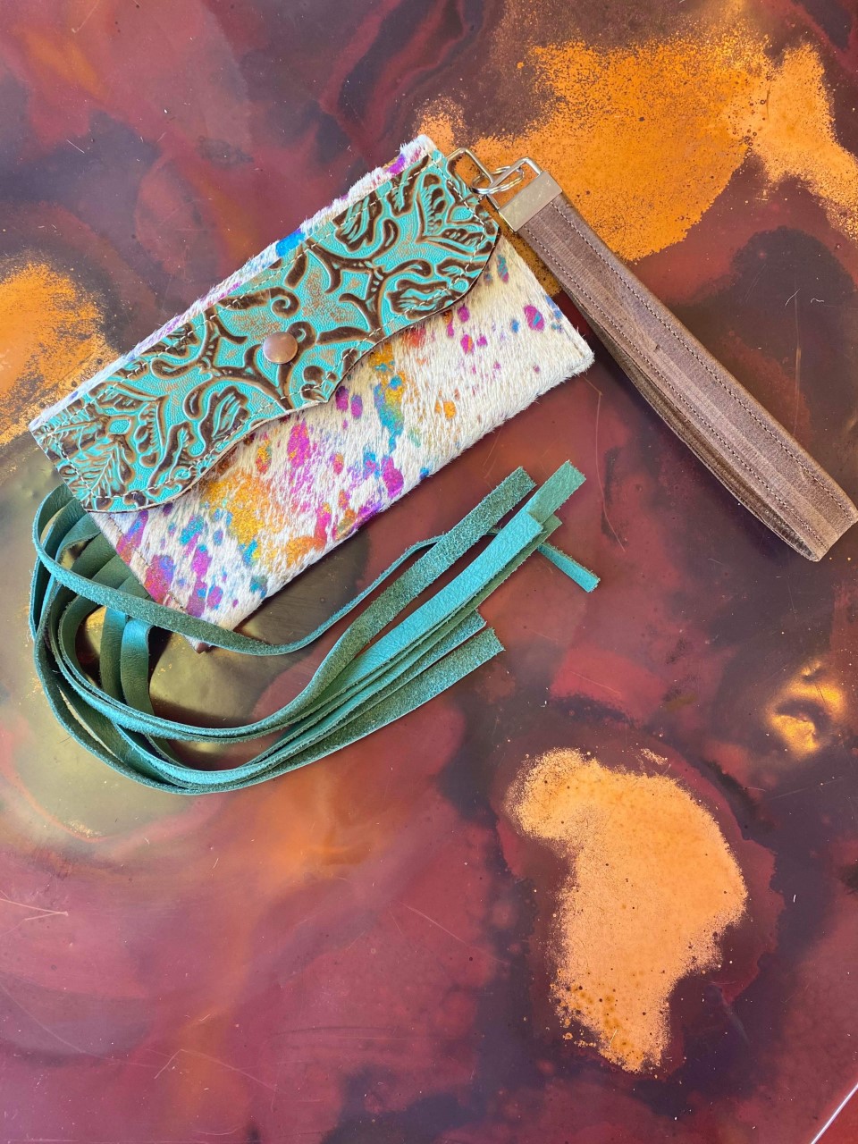 We actually just released two brand new bags. We have our Taylor and our Miranda. If you’re familiar with the Neverfull by Louis Vuitton, our Taylor is very similar, except it’s a Western spin off on that, and it’s all leather on the exterior, so it’s going to age with time. The other one is a clutch cross-body wristlet, very convertible, style bag. It can also act as a wallet. Those retail for about $125. The Taylors retail for about $300.