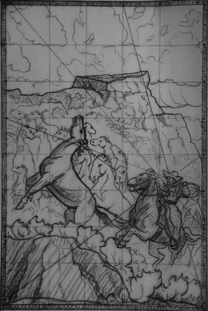 The artwork is a particularly appropriate choice for this event that kicks off during Black History Month. The 60 x 40 painting depicts a black cowhand roping a stallion out of a vast remuda in a box canyon. The cowhand is none other than Frank Chisum.