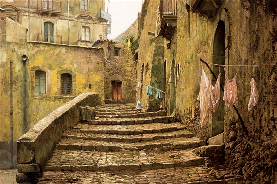 There are four Hulings in the sale. The artist, who died in 2011, was a master of capturing working people in scenes around the world; the fact that he became known as a Western painter is ironic, because most of his paintings were painted in Europe and Mexico. The paintings included in this years’ Scottsdale Art Auction convey the diversity and artistry of Hulings’ work; one is of a small blond girl in Sicily’s cobblestone streets, with laundry hanging nearby.