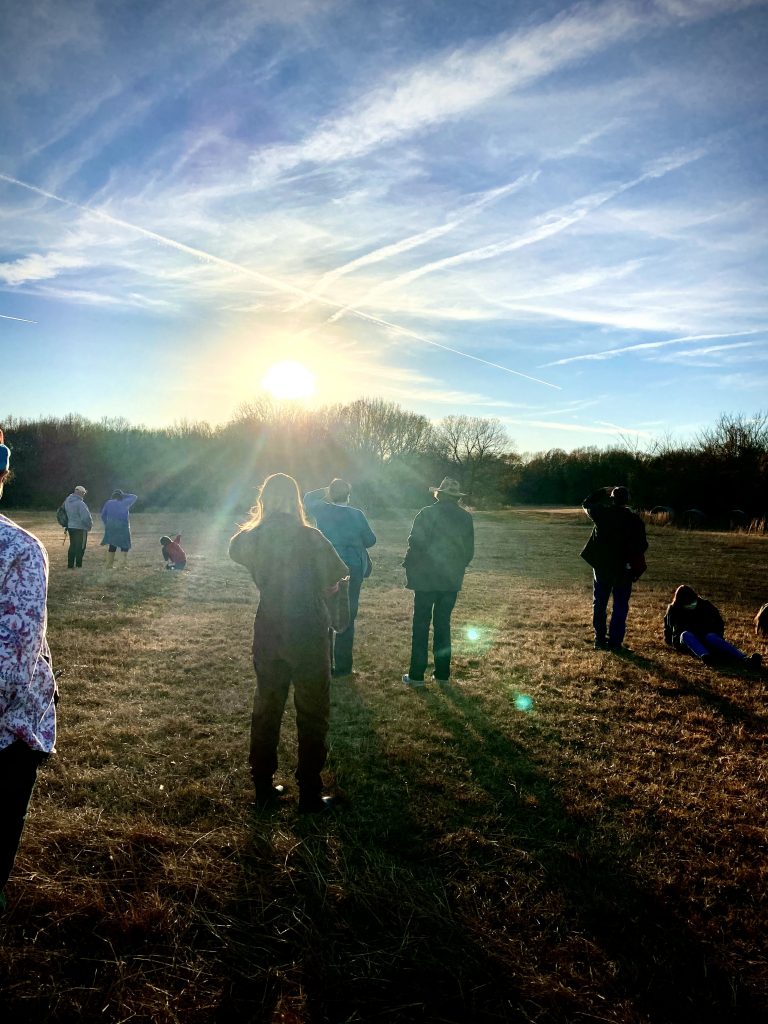As we sat in the grass and watched the sun creep downward on the shortest day of the year in what seemed the longest year ever, archaeologist and Spiro Mounds Archaeological Center director Dennis Peterson set the scene for us. On this same day, more than 1,000 years ago, this field would have been filled with writhing bodies. In the Temple Plaza at Spiro, 10,000 to 30,000 men gathered to pay homage to not only the solstice, but to the Sun God who would speak through the priests to tell them when to plant crops, how to conduct the coming months’ religious ceremonies, and other important daily tasks.