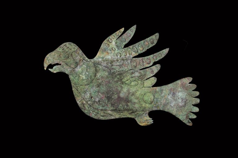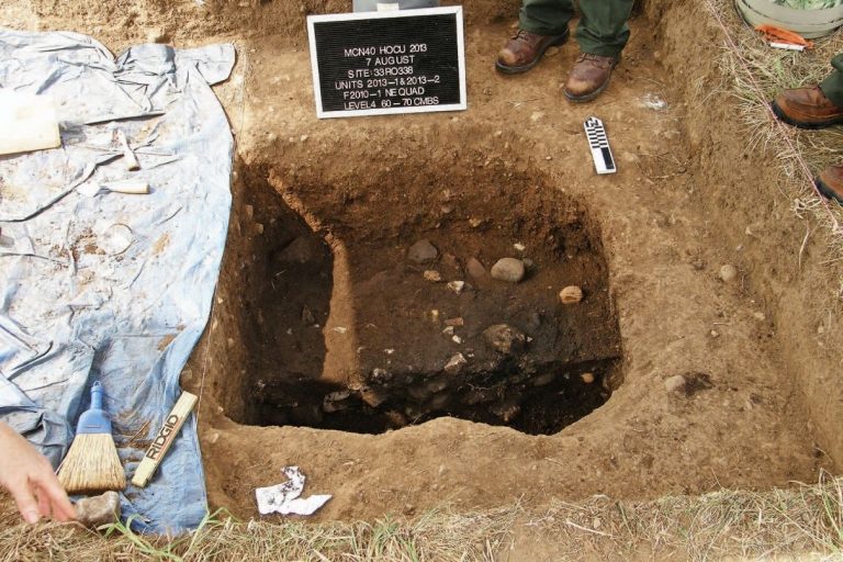 LEFT: A copper cutout of a stylized bird, made by the people of the Hopewell Culture over 2,000 years ago. This copper effigy was recovered from the grounds of the Mound City Group during the 1920s excavations by Archeologist William Mills. (Photography: Courtesy National Park Service Photo/Tom Enberg) RIGHT: Excavation at the Hopewell Culture National Historical Park circa 2013. (Photography: Courtesy National Park Service)