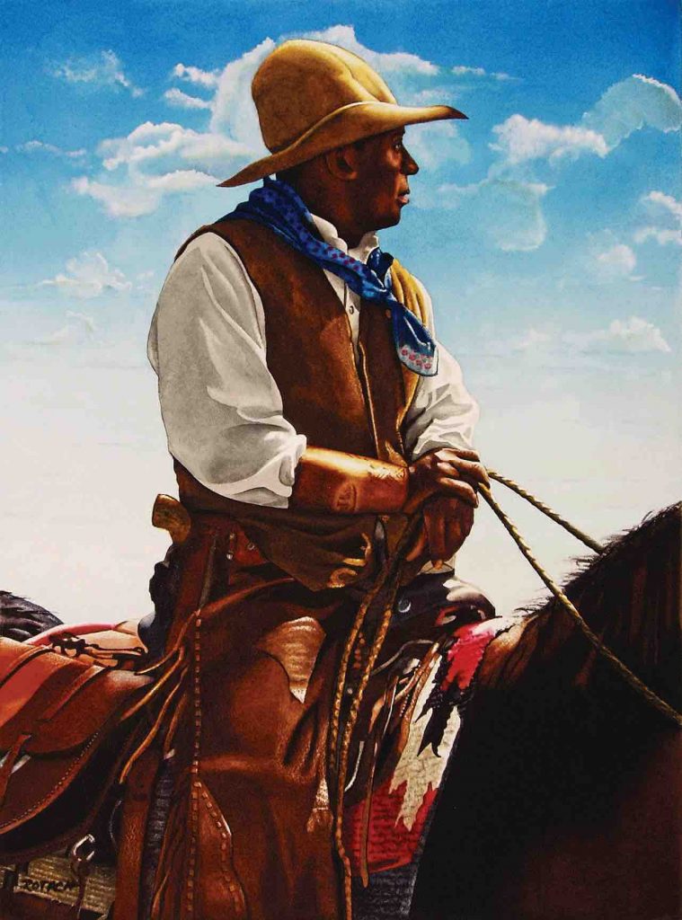 Rotach: I painted Color Guard for the American Royal, and they loved it so much, they turned it into a poster. I did it originally as a small painting, not much bigger than the poster. When I took the photograph of the cowboy with the flags behind him, I knew it was going to be incredible. It was at the Flint Hills Rodeo, one of the first rodeos I started going to. This wrangler rode up and the color guard were right behind him. Suddenly, over the intercom, comes John Wayne reciting “America, Why I Love Her,” followed by the national anthem. I’m telling you, I’m goose-bumping now, but at the time, I thought, Oh, my God, this is a moment not to be forgotten. I told the person who bought it that that painting was a preliminary study, but that someday I would do a bigger version of it and change some things.