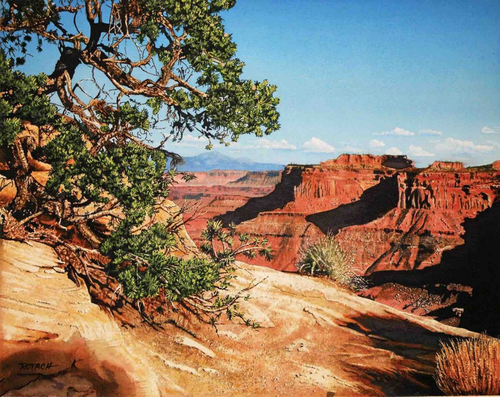The American Royal — an annual horse show, rodeo, livestock show, and barbecue competition in the Kansas City metropolitan area — decided to try an art show and wanted to feature my Western work. From there, I applied for Cheyenne Frontier Days and started doing Western shows. I met Don Weller and Cindy Long, two highly revered Western artists. We became good friends and Cindy prodded me on. She talked me into going to Utah. On a drive from Colorado to Utah I started seeing all the red cliffs and said, “This is all the movies I saw as a kid!” I don’t think I ever really thought that stuff actually existed — I was dumbstruck. By the time we got to Canyonlands National Park, I was going, “Oh, my God!” I hadn’t done landscapes in years and had always told people that the last thing the world needed was another landscape painter. But I saw challenge in Utah and started doing straight landscape paintings.