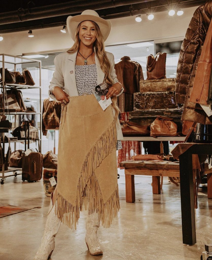We love Diné designer Orlando Dugi’s fabulous take on this sequined dress as well as more rugged approaches like Cripple Creek Apparel’s buffalo leather jacket with bone detailing and Scully’s buckskin leather and fringe skirt.