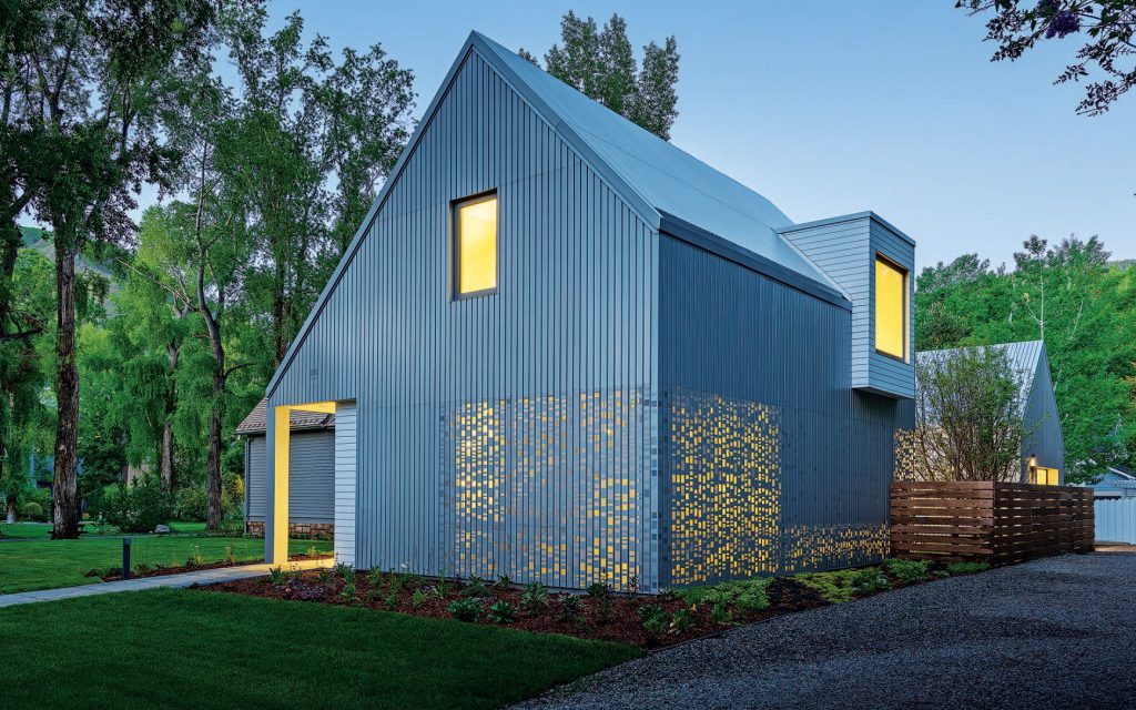 “Subtle but powerful” could describe other pages of the book as well, like the section on a classical music-loving couple’s guest house and recital space in Aspen’s historic West End neighborhood. The building’s aluminum siding features light-filtering, laser-cut patterns representing different parts of the wife’s favorite musical score, Chopin’s Nocturne in E-Flat Major, Op. 9, No. 2. “The perforated façade literally puts on a show throughout the day in terms of how light comes through the façade and then reflects off various surfaces and textures in the home,” says Kennedy.