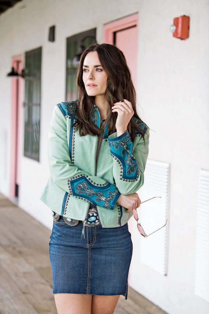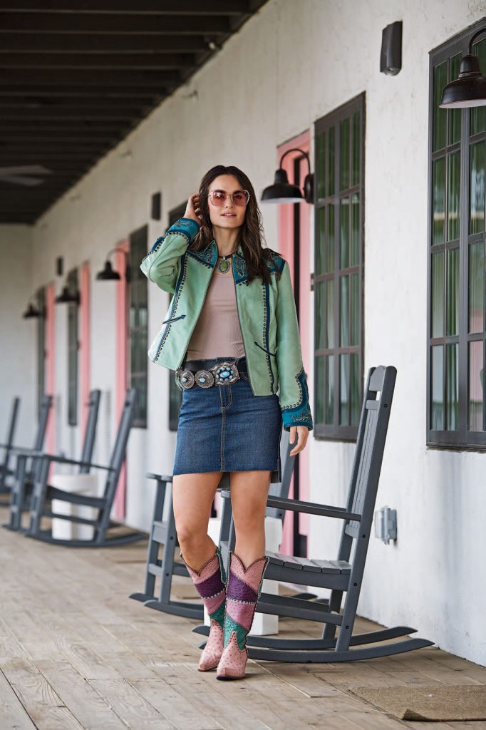 Vibes In Pink sunglasses ($59.95), americanbonfireco.com. Multi-braid leather necklace ($88) and Kingman turquoise cluster pendant ($770), lauraingallsdesigns.com. Double D Ranch Sheridan style jacket ($898), annsturquoise.com. Pink tank top (C&I’s own). Geraldine Yazzie (Navajo) Golden Hills turquoise and sterling silver concho belt ($6,000), coloradojo.com. Wrangler denim skirt (C&I’s own). Rockstar Cowgirl ostrich patchwork boots ($4,110), falconhead.com.