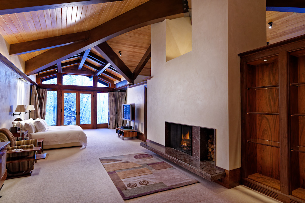 The property boasts 23,077 square-feet under roof, which includes a guest house, caretakers’ homes, offices, and maintenance facilities, as well as the main house, designed by Thomas Kligerman of Ike Kligerman Barkley. The main house is described as “arts and crafts style on a Rocky Mountain scale” with 13,175 square-feet and nine wood-burning fireplaces, including a Colorado dry stack moss rock fireplace in the living room. The space is framed with floor-to-ceiling windows offering sweeping mountain views.