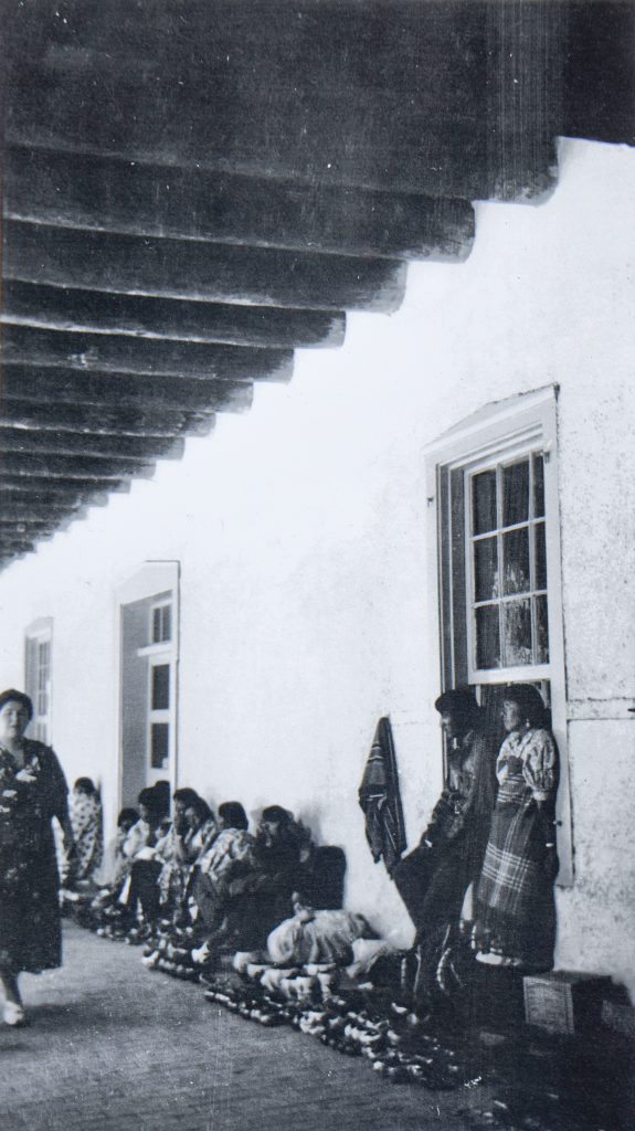 Zia pottery vendors under Palace of the Governors portal, 1938.