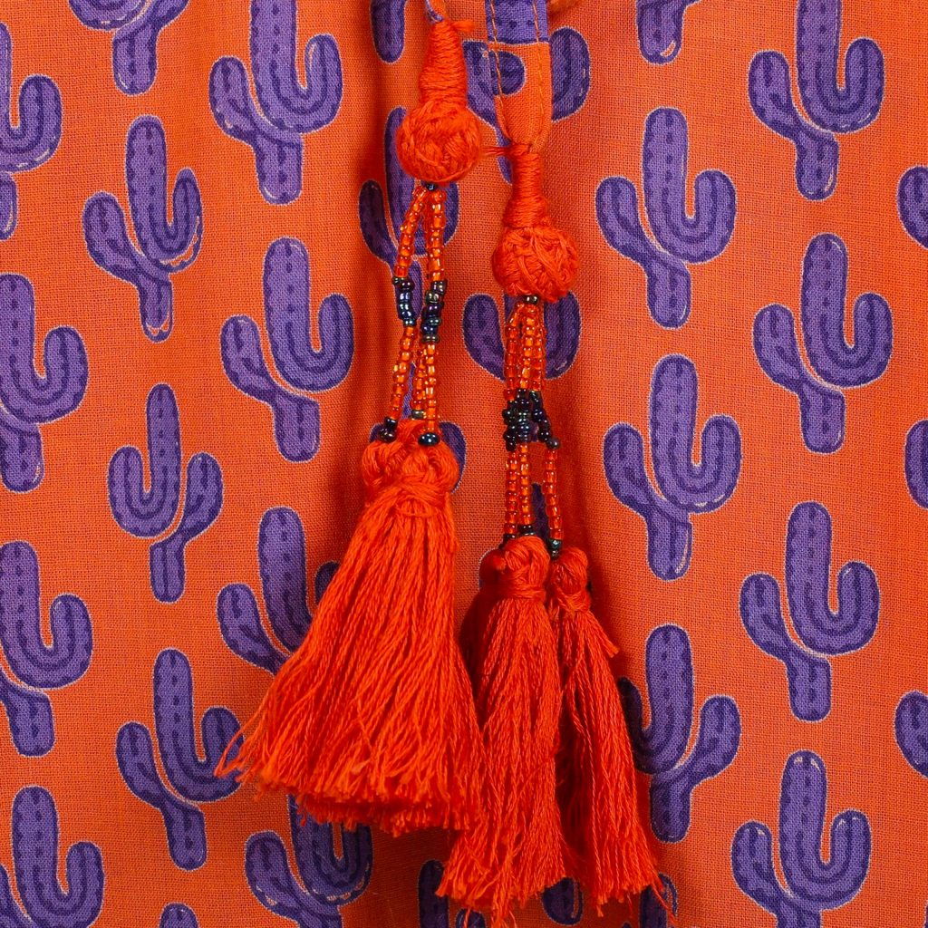 With our exclusive Prickly Pax cactus print we salute the epic saguaro cactus that is found only here in the beautiful state of Arizona. The best woodblock cutters had to be found to carve this design into the blocks used to print this tiny cactus in such exquisite detail. The tassels on drawstrings are hand beaded.