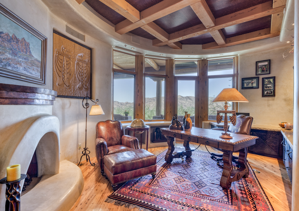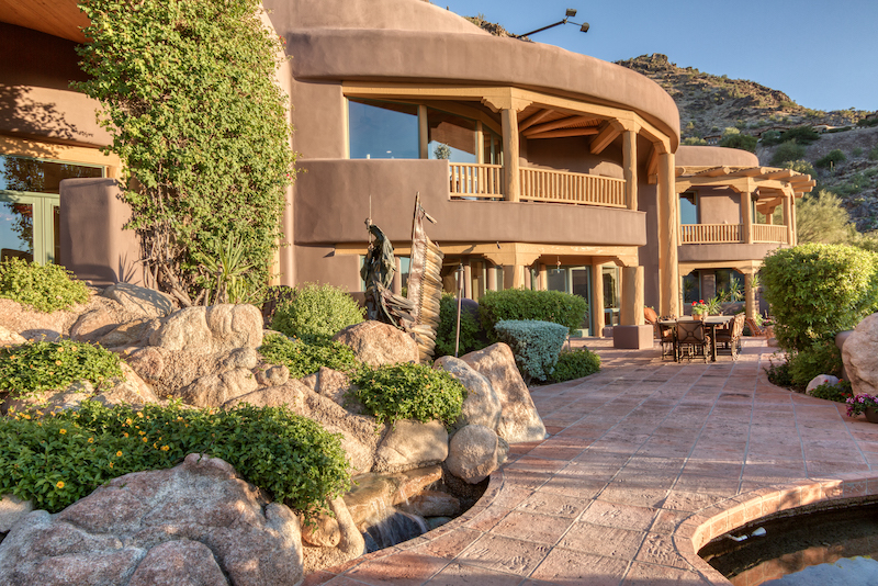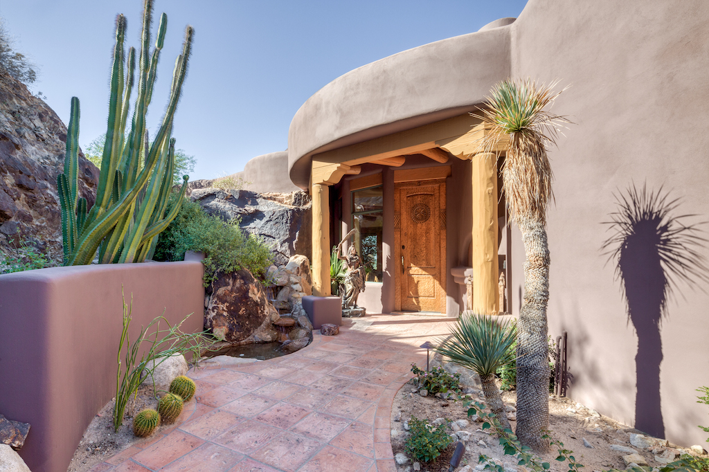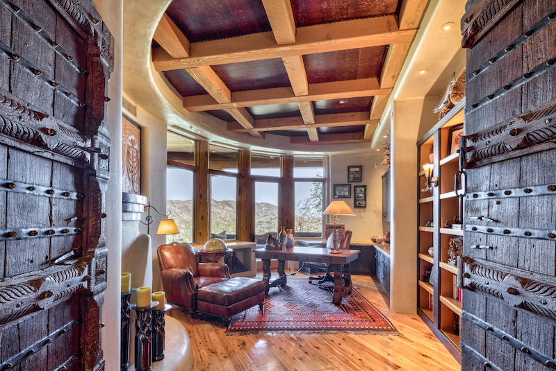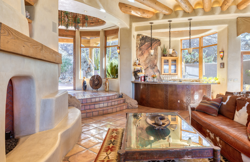 Las Brisas Haven is built into Mummy Mountain and blends seamlessly into its natural surroundings. There are rock outcroppings integrated into the 7,318-square-foot home, a natural extension of the surrounding outdoor beauty.