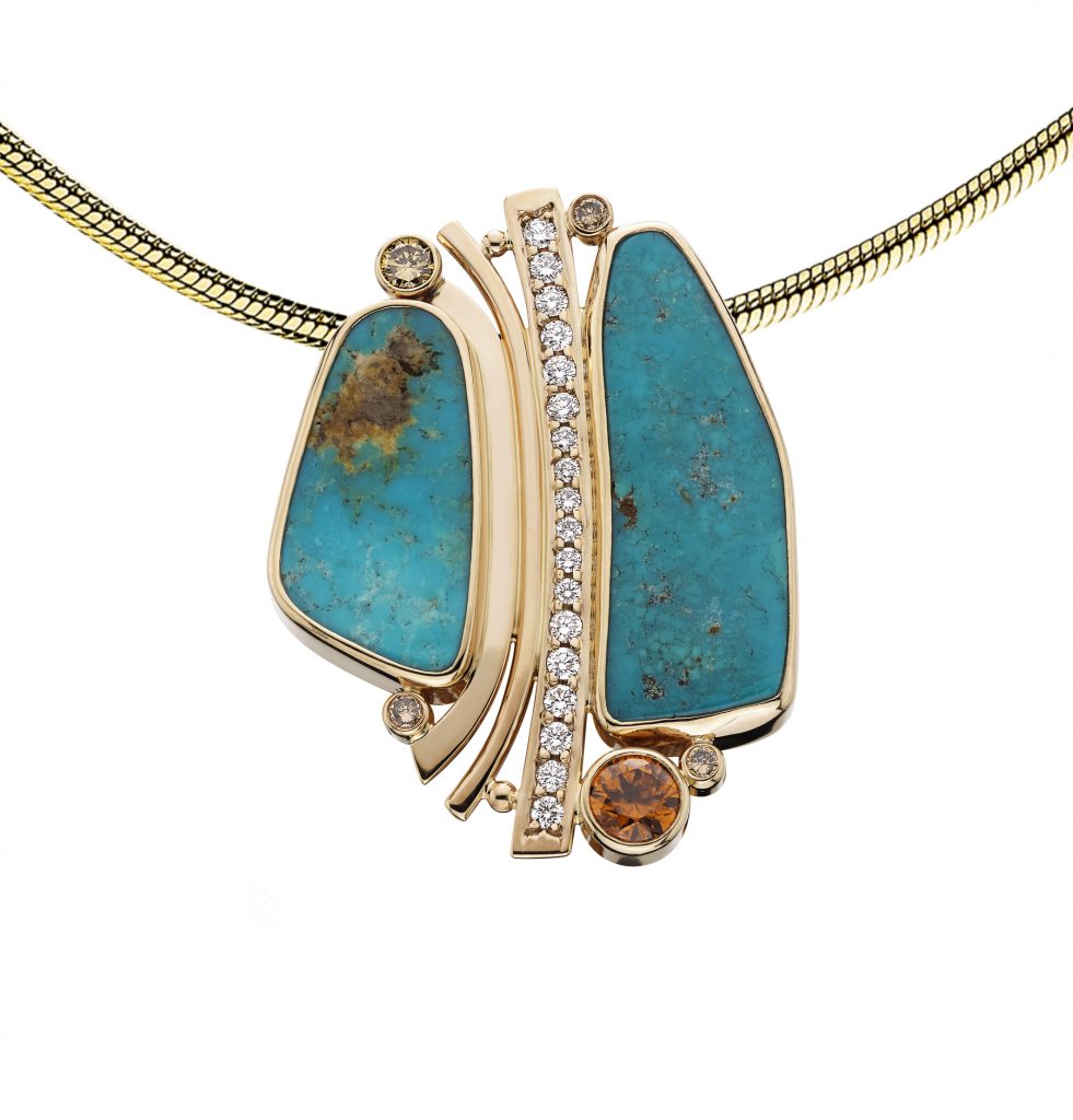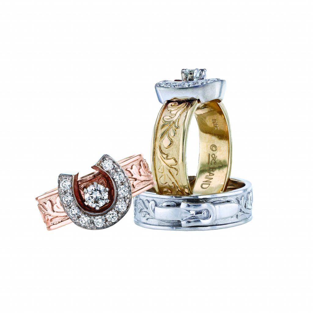 Western Horseshoe ring with diamond solitaire in white, yellow and rose ($3,125), bennettfinejewelry.com; Hair On Tall Blanco Cafe boots ($340), libertyblack.com; Anthracite American alligator clutch purse ($6,995), mercuryleatherworks.com; Bracelet by Raymond C. Yazzie (Navajo) — sterling silver set with coral, Lone Mountain turquoise and variety of accent stones, Best of Show at Inter-Tribal Indian Ceremonies in 2022 (contact for pricing), leotasindianart.com; Bohlin three-color gold Indian head trophy buckle with filigree scrolls ($3,895), bohlinmade.com; Royston turquoise droplet cuff by Aaron Toadlena (Navajo) ($2,330), store.nationalcowboymuseum.com; 14k yellow gold pendant with natural turquoise, brown zircon, white and cognac diamonds ($5,450), hines-gold.com; Mid Rise Collection purse with embossed cowboy-tooled leather, Pendleton wool inlay, authentic bison front ($429.99), hmranchstore.com; Fully custom, hand-engraved watch with 24k gold inlay (contact for pricing), readsjewelry.com.