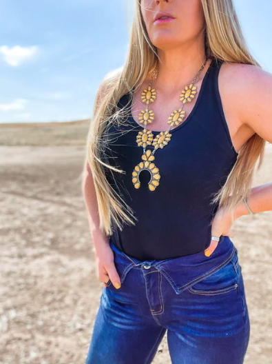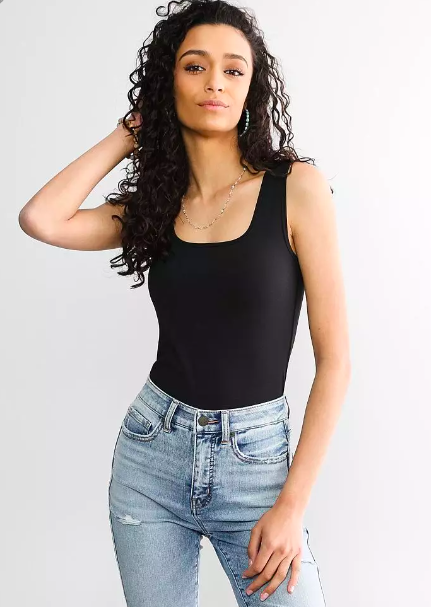 Tank top: Black Sleeveless Faux Leather Bodysuit ($29.99), thelacecactus.com; Scoop Neck Bodysuit ($34.95), buckle.com; The Payden Bodysuit ($32), wesleysboutique.com.