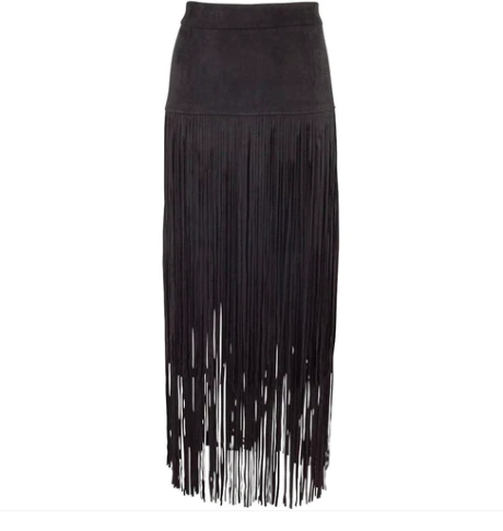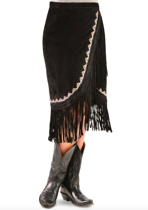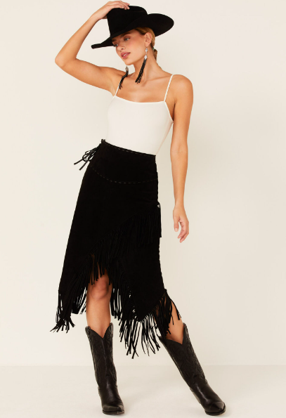Skirt: Scully Women’s Fringe Skirt ($190), bootbarn.com; Kobler Leather Women’s Yuma Fringe Suede Skirt ($233), sheplers.com; Adore Faux Suede Long Fringe Skirt ($85), pintoranch.com.