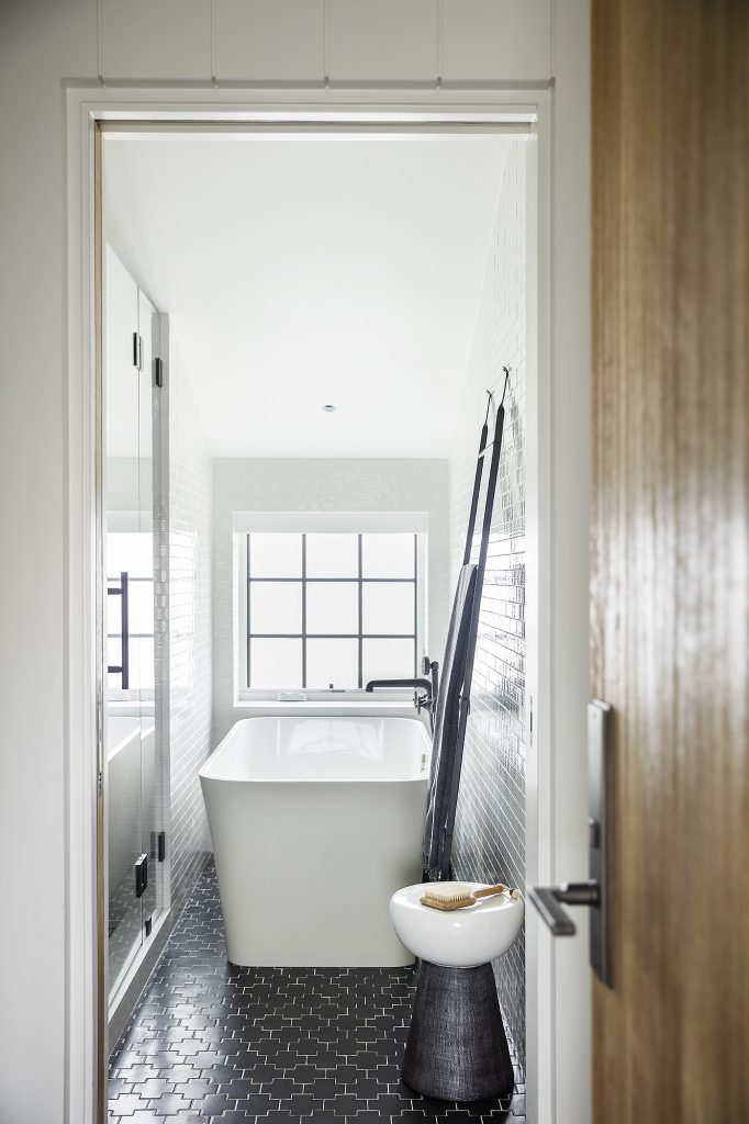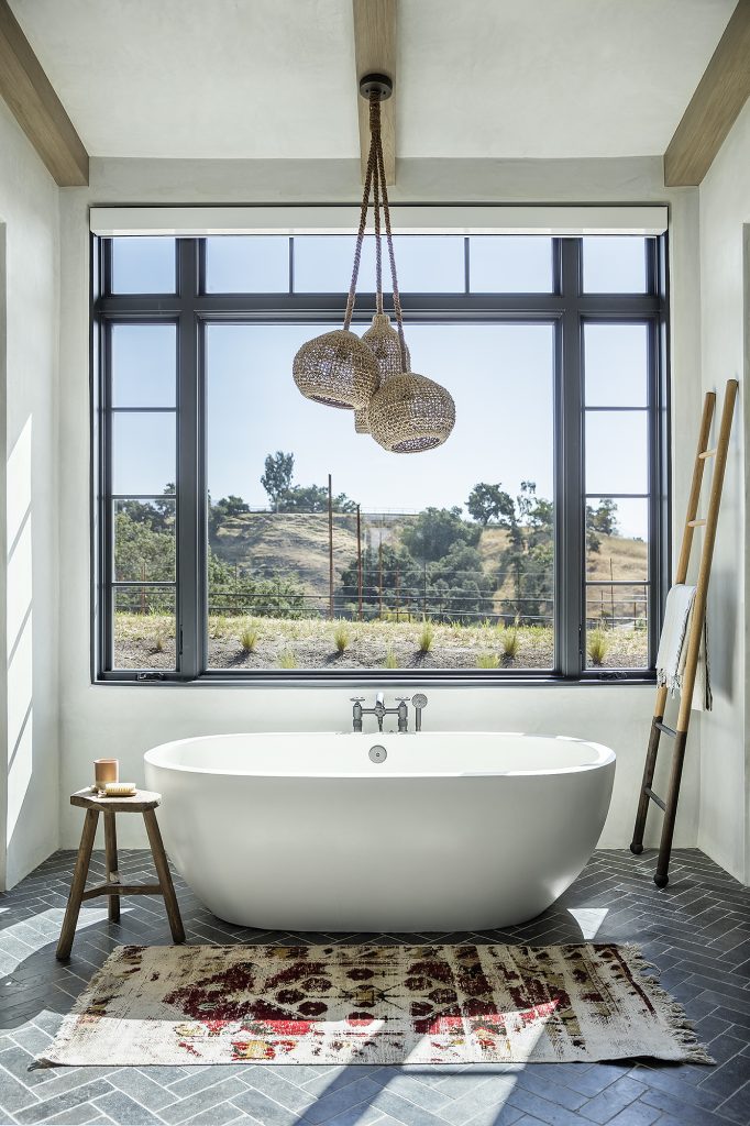 Dark herringbone tile contrasts with white grout in the primary bathroom to provide a dramatic base for a free-standing tub with a view to luxuriate by.