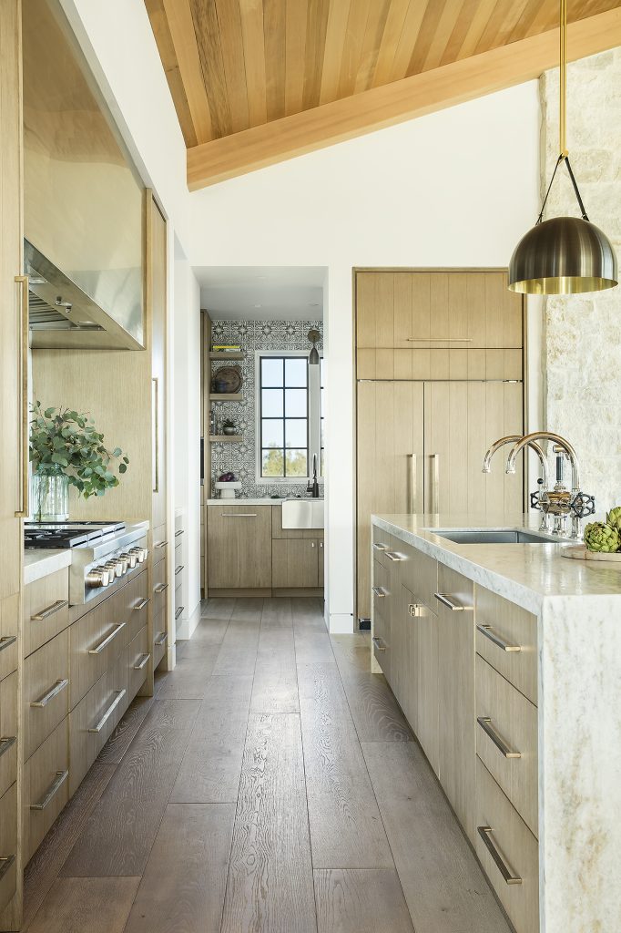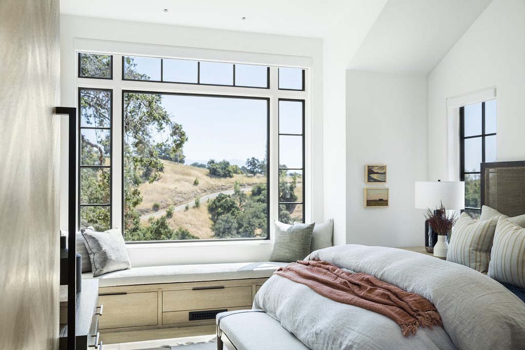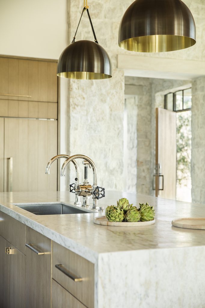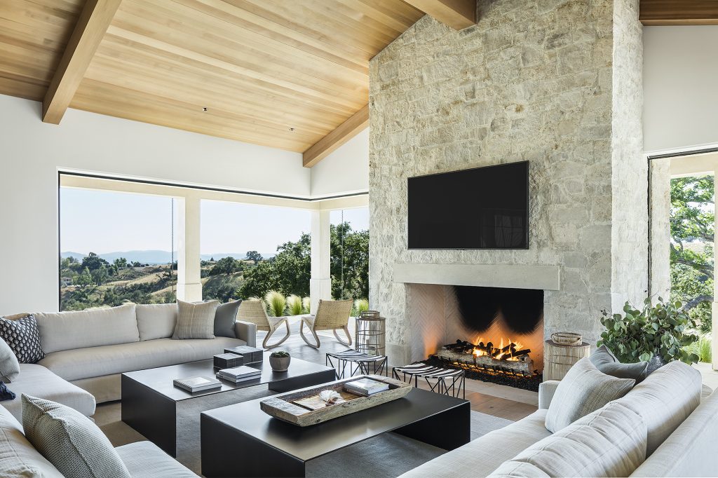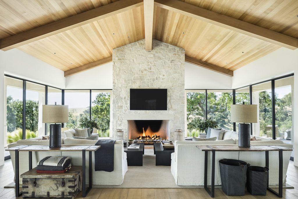 The bucolic setting also influenced the 5,340-square-foot, six-bedroom, six-bathroom home’s overall design and materials, which include palomino stone, Western red cedar, metal, glass, and a smooth-coat stucco finish. “This is a transitional approach to a modern farmhouse design that fits within the surrounding fabric of the Santa Ynez Valley,” says the architect. It’s also a hands-on approach: Brandon personally selected the exterior tumbled palomino limestone from Sandrine Scott Commodities.