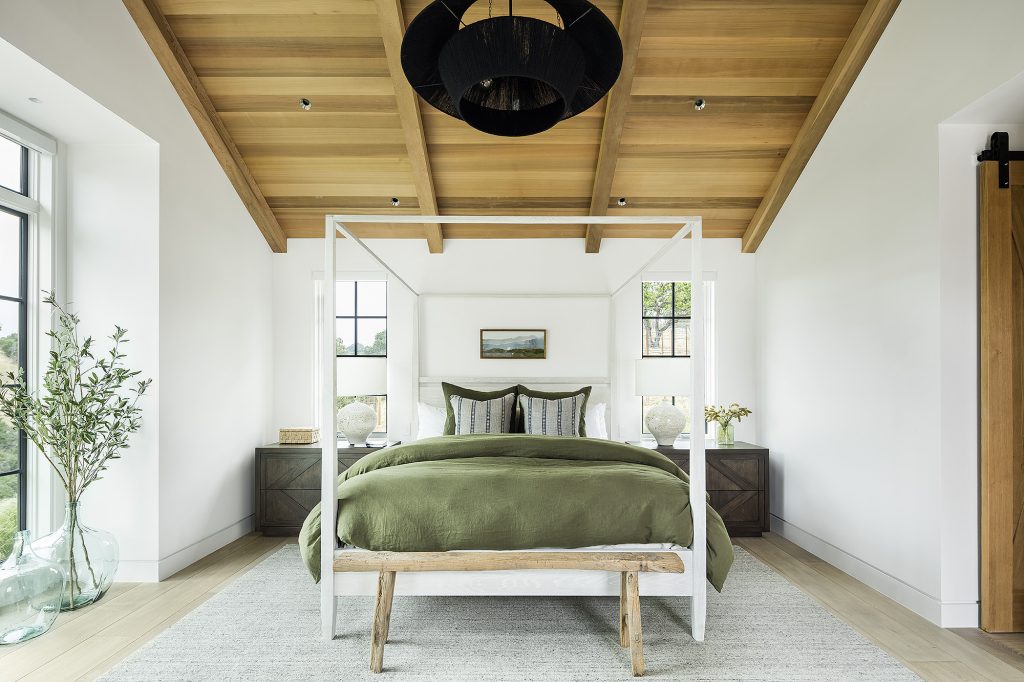 The primary bedroom takes its color cues from the views just beyond the large windows. A neutral rug lays the groundwork for a woodsy canopy bed, deep green linens, and earth-tones furnishings. While living areas and sleeping quarters are located on opposite sides of the house, everyone meets in the middle to soak in the sun poolside.