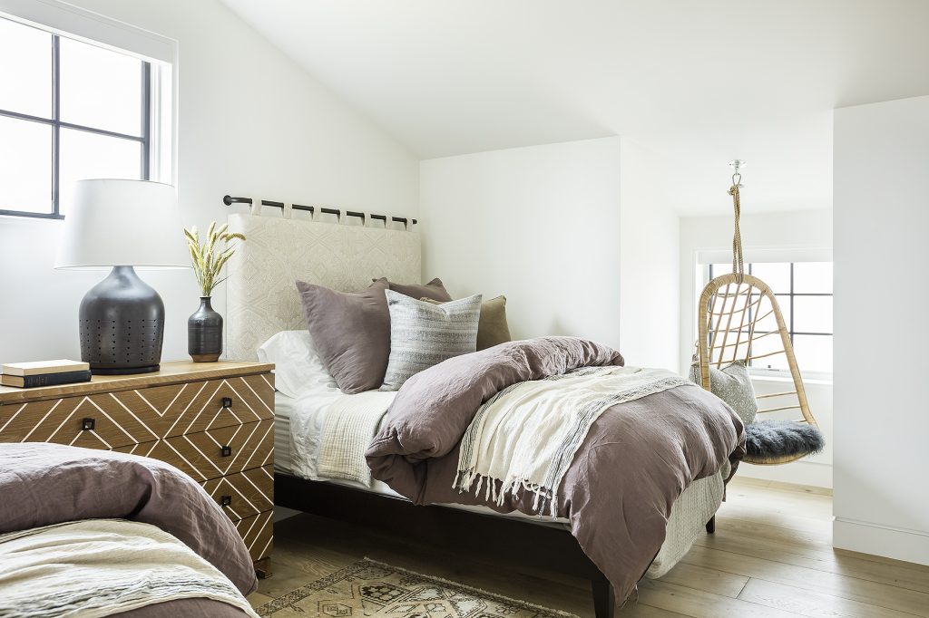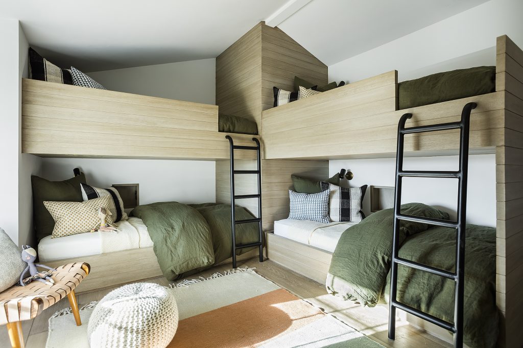Located near the entrance, the barn offers everything needed for a good time, including video games, a pool table, foosball table, shuffleboard, and a bar. Assorted textures come together in a guest room via patterned headboards, graphic side table, and a woven hanging chair. The bunk house above the garage contains this sleep-a-crowd space, a smaller bedroom, and bath.