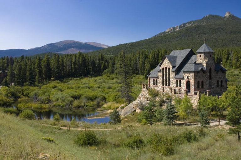[Left] Picturesque stone chapel near Estes Park Colorado (Courtesy of Denise Chambers/Miles, Courtesy of the Colorado Tourism Office)