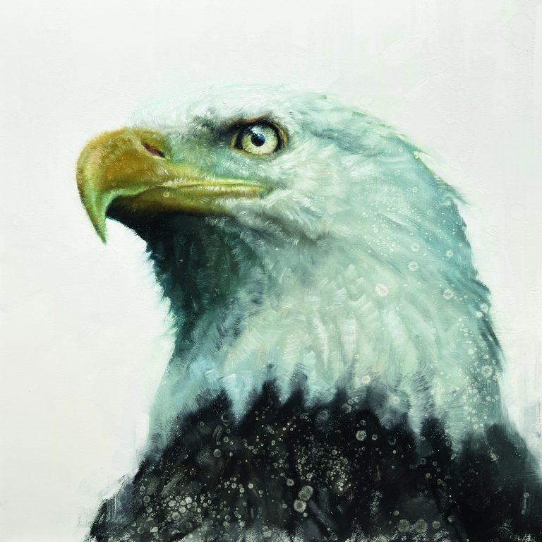 In Utah, he studied with a handful of esteemed, successful figurative artists and got serious about developing what would become his own distinctive style. “I needed a break from the complex classical portrait paintings I had been doing, so I started painting wildlife just for fun. I had this idea in my head, Go get a big canvas and some house-painting brushes and just go wild! Get loose — have fun! Throw paint around! But then this other voice in my head says, ‘Detail everything — get every eyelash!’ So, I thought, How can I please both voices? At the time it was the ‘loosen up voice’ for sure that was underserved.”