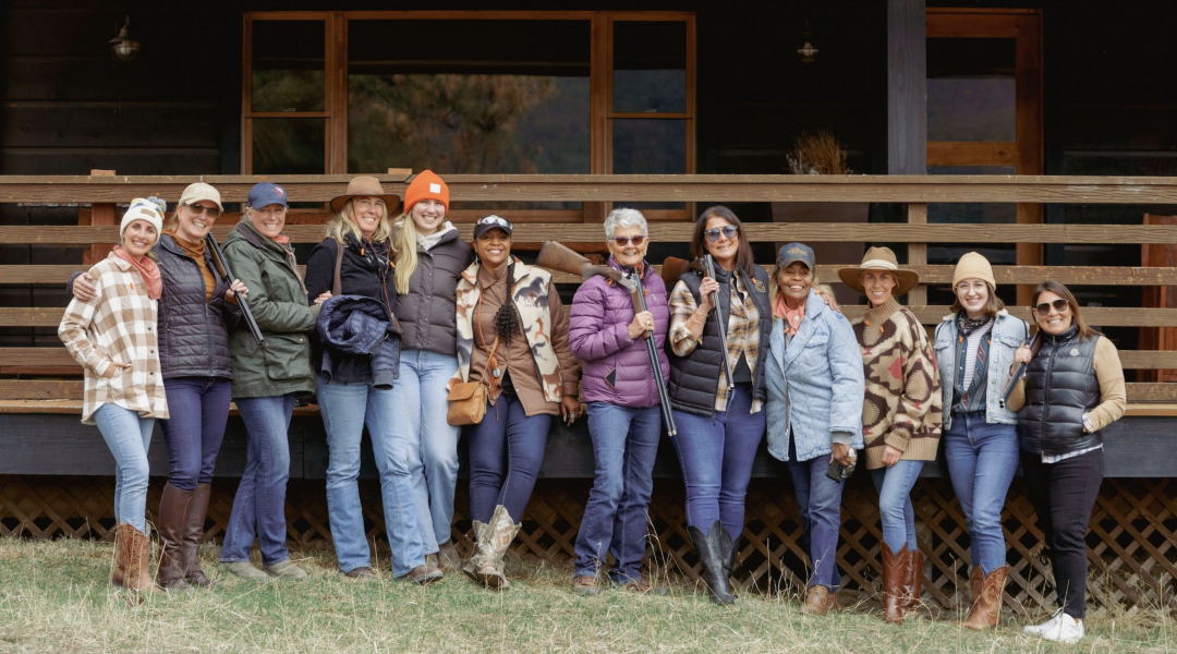 2015 Cowgirl Hall of Fame Honoree Patricia Kelly (fourth from right) and daughter Heather Lawson (sixth from left), 2022 Texas Cowboy Hall of Fame Honoree Patti Colbert (fifth from right), and fellow attendees smile after a successful day at the Resort at Paws Up’s shooting range.