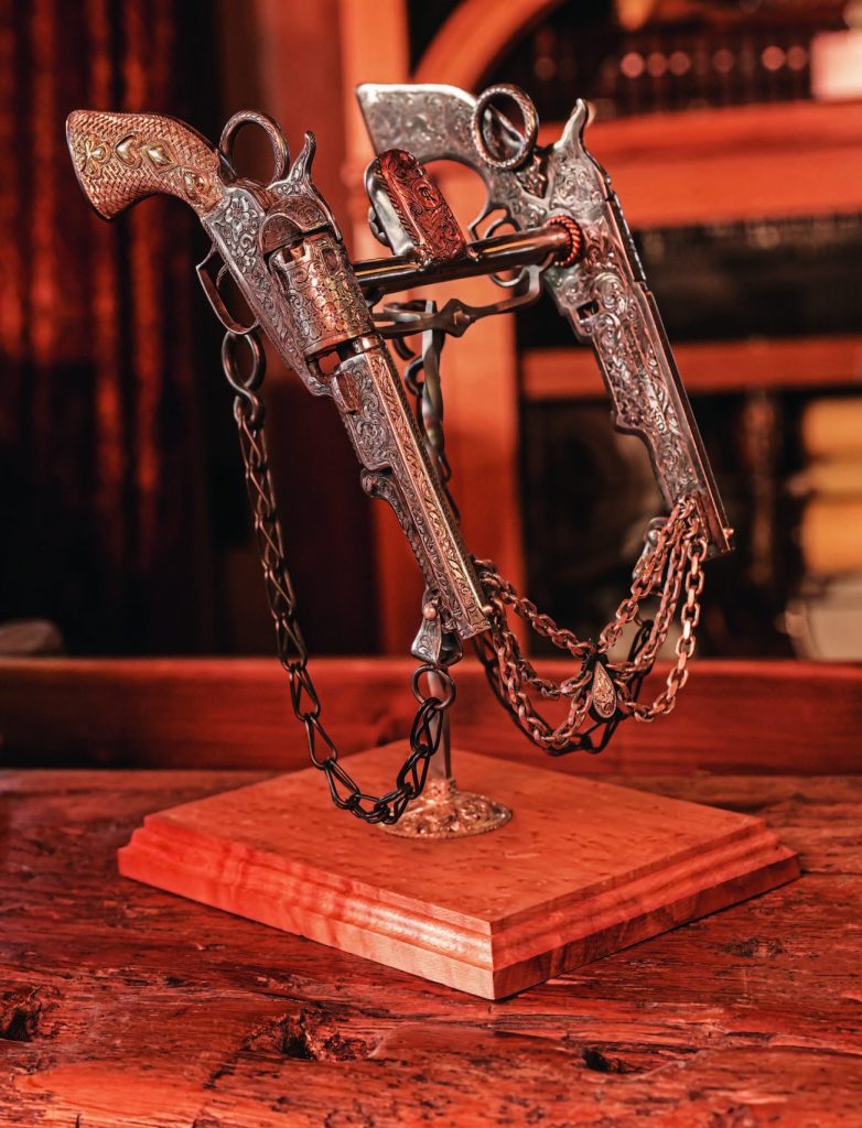 “The art-collecting community has come to value the work and artistry as we have. They’re learning it’s just as wonderful to take in the intricate designs on a bit or a buckle and the elaborate carving on a saddle as it is to see a beautiful painting on the wall or an interesting sculpture displayed on a pedestal. The appreciation has begun to settle in,” Nicholas says. “The nice thing about Western art is that it creates authenticity. When somebody has a home in Jackson and they’re leaning into more outdoor activities and an appreciation of the West, this traditional cowboy art brings the realism of the area to the interiors.”