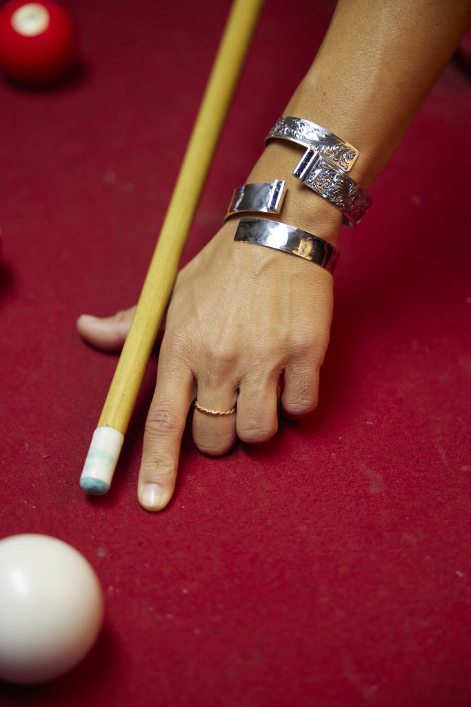 Kittie Mae hat, saintshatco.com ($450); Winged Heart green turquoise brim bloom kit ($265), maverickwesternwear.com; Pink metallic beaded bandana (contact for pricing), cavenders.com; Rowdy crowd silver metallic fringed yoke short sleeve top ($39), cavenders.com; Boonie cuff ($469), Harmony cuff ($409), vogtsilversmiths.com; High rise velvet lisha bootcut jeans ($149), 7forallmankind.com; Blazin Roxx scallop crystal cross concho western belt ($59), cavenders.com.