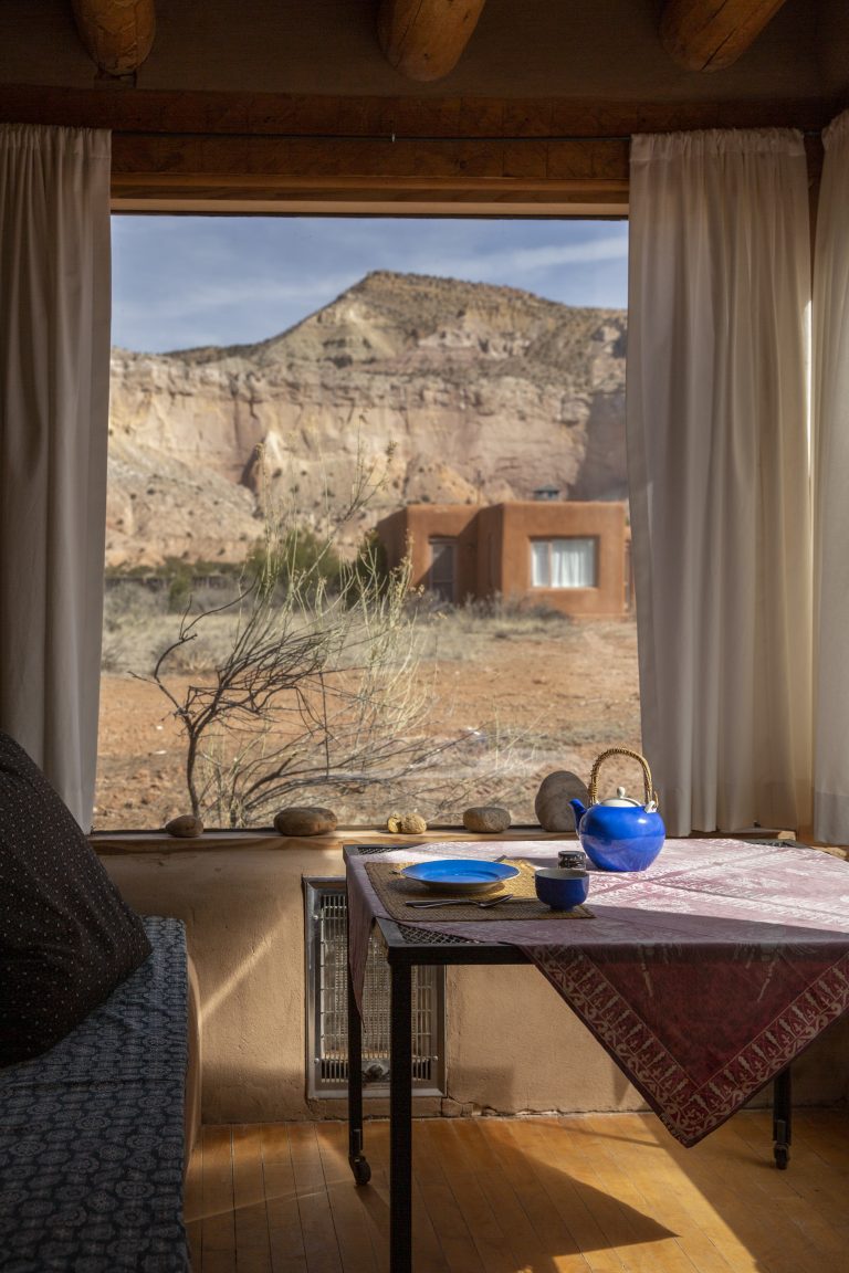 When she wasn’t touring the Far East or painting at her New York City studio, O’Keeffe headed west. She was introduced to New Mexico by way of Taos and spent a few summers with friends and fellow creatives like Rebecca Salsbury James and D. H. Lawrence in the 1930s,” Renzoni says. “There was already a real trend of artists coming to Taos then, and when O’Keeffe arrived, she initially stayed within a group setting.”