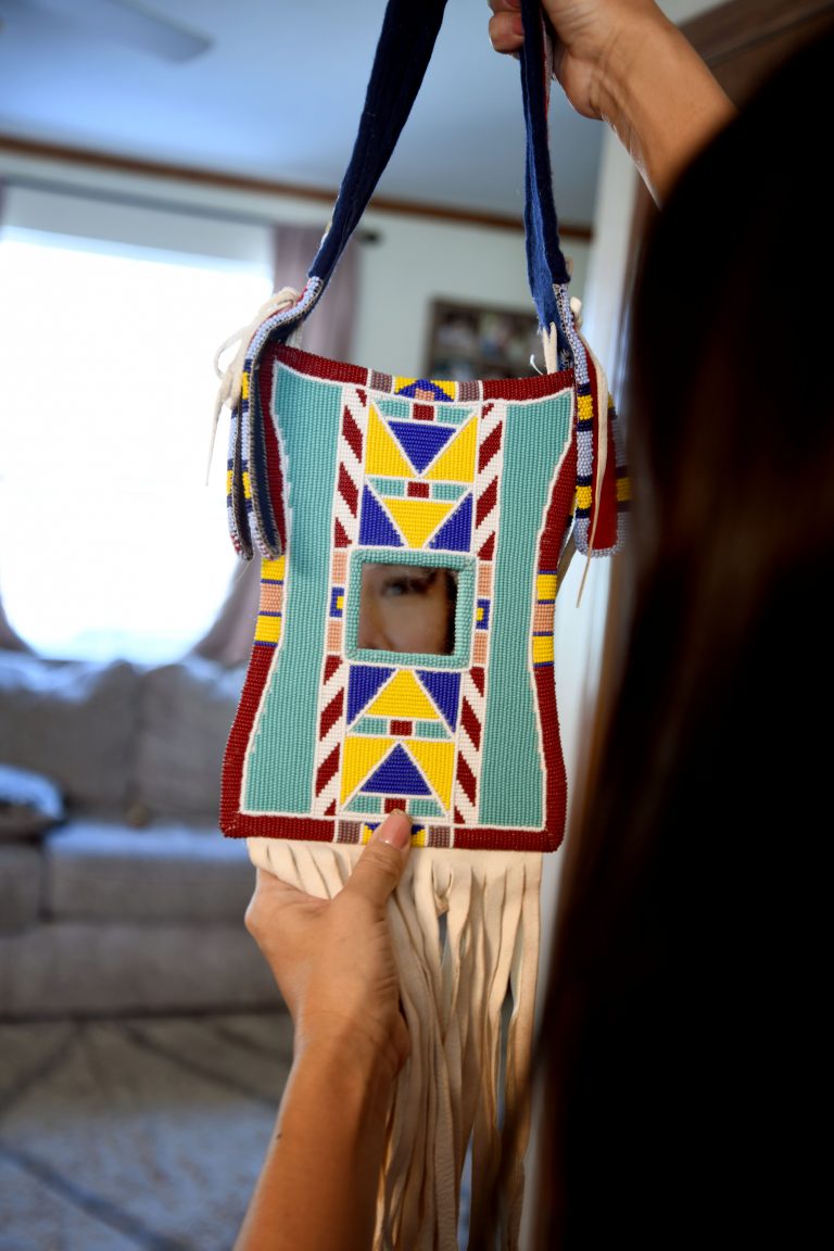 I was actually able to go to the Autry Museum last year and look at beadwork there, which was really special. I came to the conclusion that beadwork is the way that we showed our love for our people. Even now I’ll hear it — when somebody goes by, and they see someone all in their beadwork, they’re like, “That person’s really loved.” I’ve heard that several times. When we were roaming the plains, think about all the work women did. They did everything. They put the tepee up. They cooked. They raised their kids while our men were out hunting and going to war and protecting us. They did everything. Just think about the time that they took away from all of that to do all this beadwork. Back then they didn’t even have all the amenities that we have now, like an air conditioner, TV, even just a comfortable couch. I’ve seen pictures where they’d be outside, just sitting on the ground, beading. It was really cool. So, that’s what it means to me — it shows the love I have for my family. I love seeing them use my stuff. I don’t know what it is. I can’t explain it. It’s just a sense of pride. It’s the way I show my love because I like to see them in what I’ve made. Seeing them ride by, it’s just a beautiful thing.