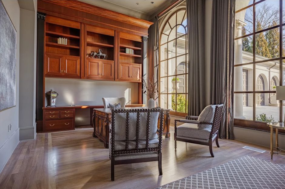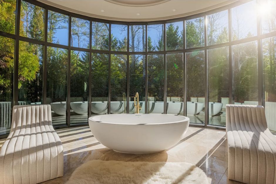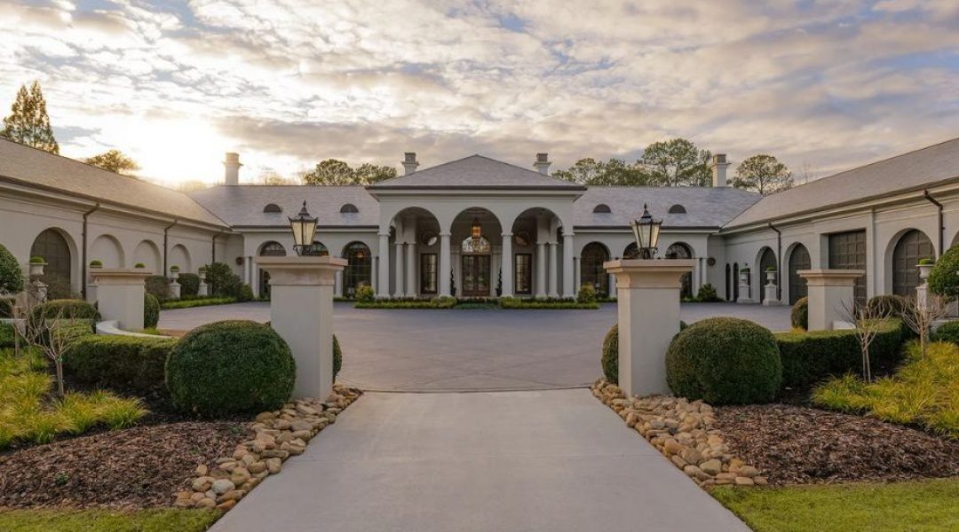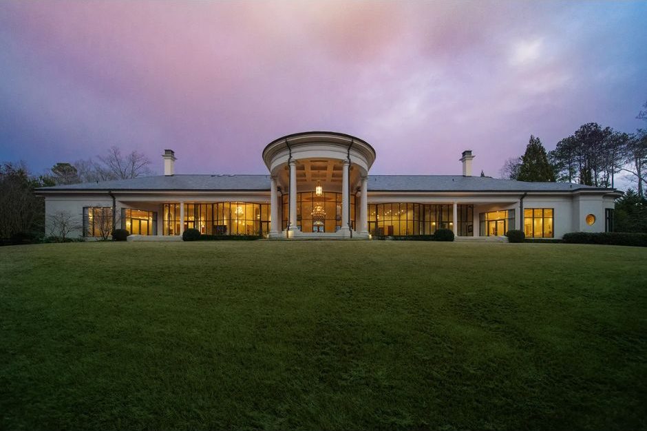 Surprises abound behind the gates of this Milton, Georgia, estate. Built by Ron Wallace, the former president of UPS International, in 2002, the almost 25,000-square-foot Neoclassical home features all the usual high-end plusses like a well-appointed gym, luxe theater, spacious bedroom suites, floor-to-ceiling windows, high ceilings, rich mahogany cabinets, and a sleek living room bar.