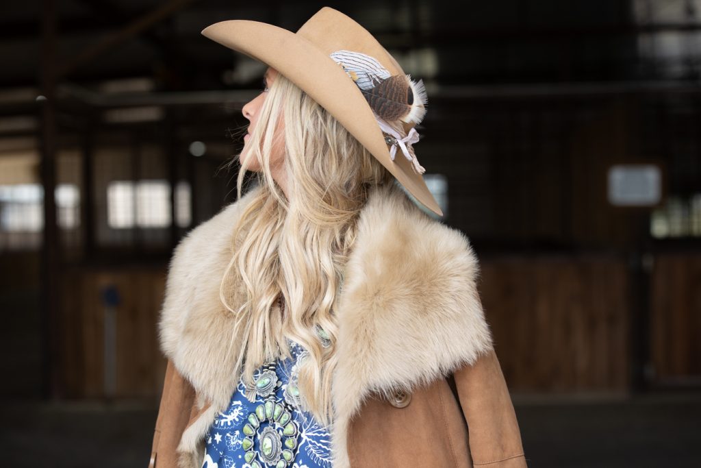 Stellar felt hat in buckskin, baileyhats.com; Turquoise bar necklace, cowboyjewelers.com; Kristopher Brock x Tecovas Ava dress, tecovas.com; Fringe denim jacket, scullyleather.com; Emmer blue boot, oldgringoboots.com.