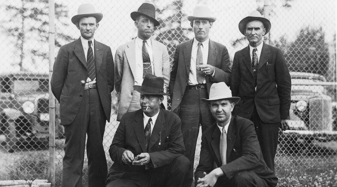 Photograph of the team that took down Bonnie & Clyde, each identified in handwriting. The senior officers seated front, left to right: Deputy Bob Alcorn, Dallas County S.O.; Sheriff Henderson Jordan, Bienville Parish, La.; and Frank Hamer, Texas Prisons/Texas Highway Patrol; Standing in back, left to right: Deputy Ted Hinton, Dallas S.O.; Deputy Prentiss Oakley, Bienville S.O.; and Maney Gault, Texas Highway patrol (PHOTOGRAPHY: Courtesy of the Texas Rangers Hall of Fame and Museum).