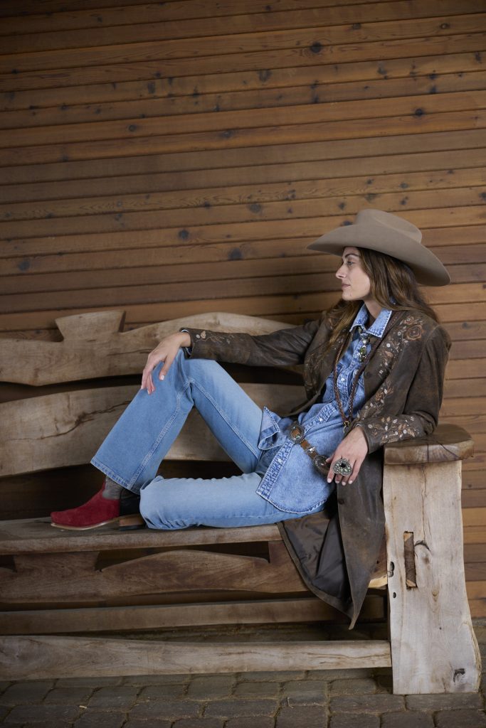 Skyline felt hat in Sahara, stetson.com; Turquoise and coral hoop earrings, cowboyjewelers.com; Durango denim shirt, kimesranch.com; Royston turquoise bead necklace, spunkysteer.com; Lightning stone necklace, denisehagoodstudio.com; Embroidered leather jacket, scullyleather.com; Vintage Don Lucas turquoise concho belt, coloradojo.com; Kingman and Black Onyx heart ring, hippiecowgirlcouture.com; Wrangler flare jeans, wrangler.com; Burgundy roughout with blue eagle top boots, fenoglioboot.com.