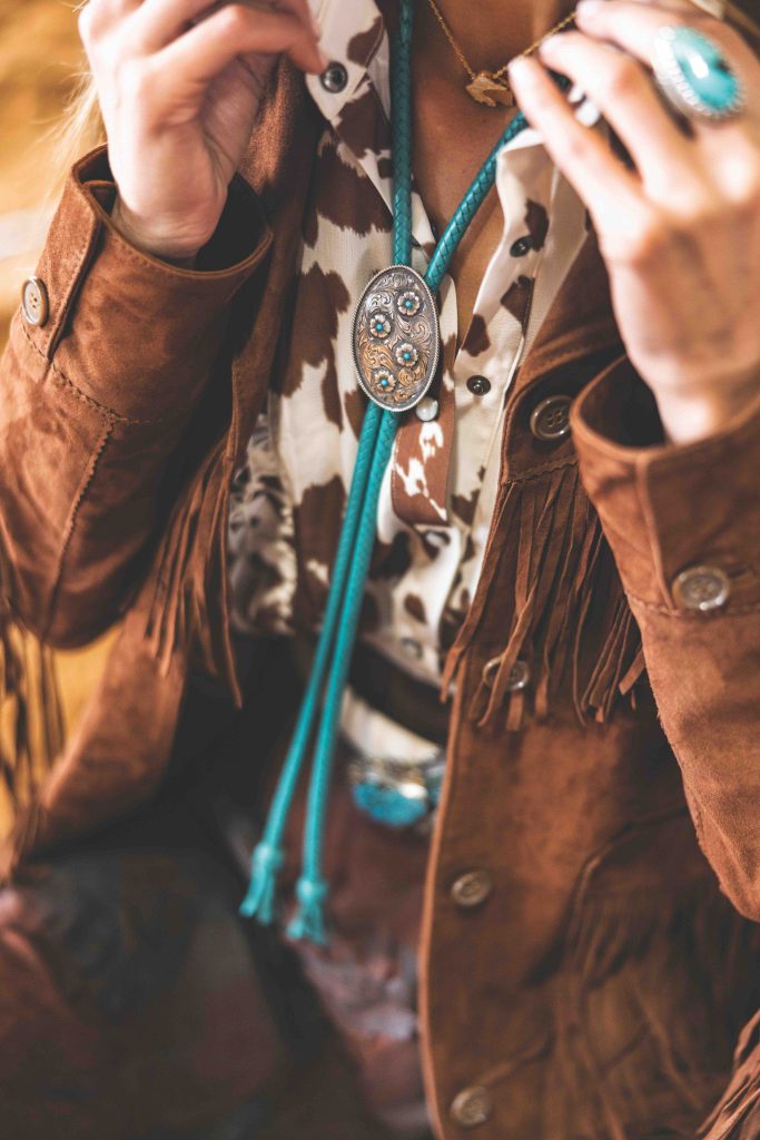 Wild Cherry felt hat, westernlegacyco.com; Diamond Pave’ Queen Buffalo pendant, thegoldenbuffalo.com; 1866 bolo and string, Cactus Trophy belt buckle, and Premium Gen 3 alligator belt, clintorms.com; Path of Least Resistance ring, zierjewelry.com; Black Widow turquoise ring, kirpachbrayclets.com; Fashion Express cow print ruffle top, cavenders.com; Stetson fringed jacket, nathaliesantafe.com; Pat Dahnke brown distressed wrap skirt, rockabillybaroness.com; The One Star boots, oldgringoboots.com.