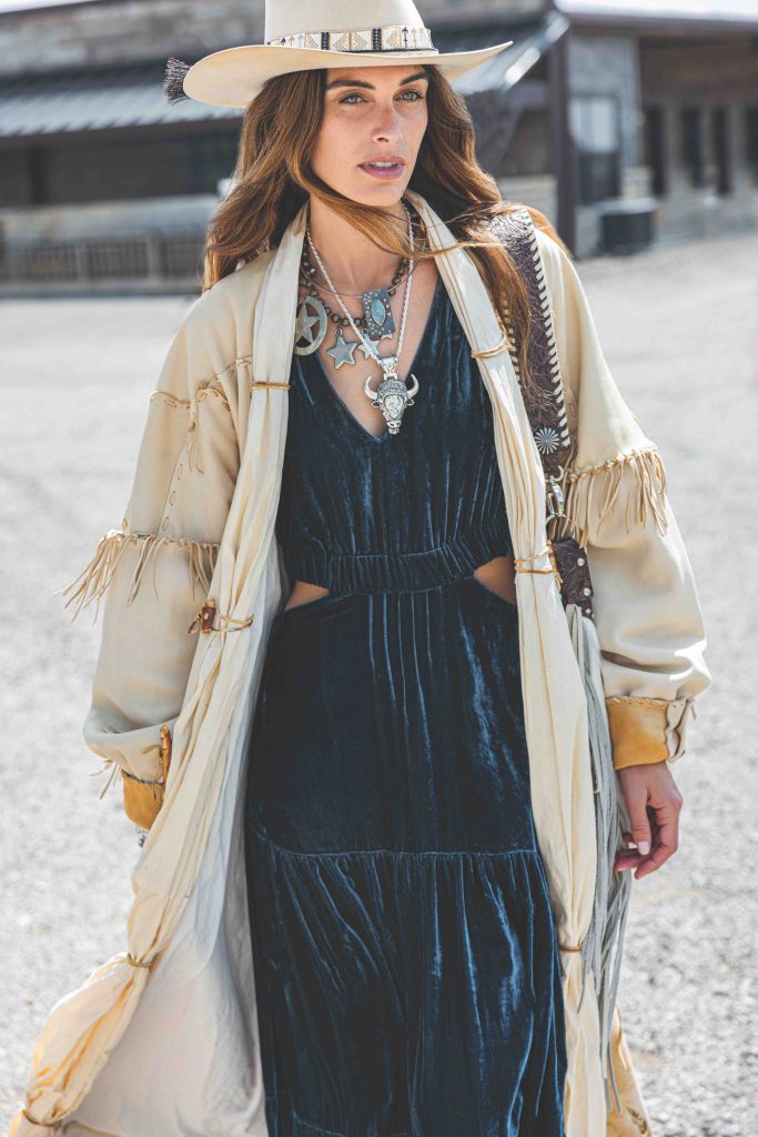 The Legend distressed hat, jwbennett.com; Dried Grass duster, montanadreamwear.com; Eye See necklace, zierjewelry.com; Deep In The Heart necklace, tresmelindas.com; Buffalo necklace, cowboyjewelers.com; Standing Tall Springbox handbag, hmranchstore.com; Coyote Weed dress, doubledranch.com; Wild Horse stone cuff, jewelryladyredriver.com; Emma Jane boots in cognac, laneboots.com.