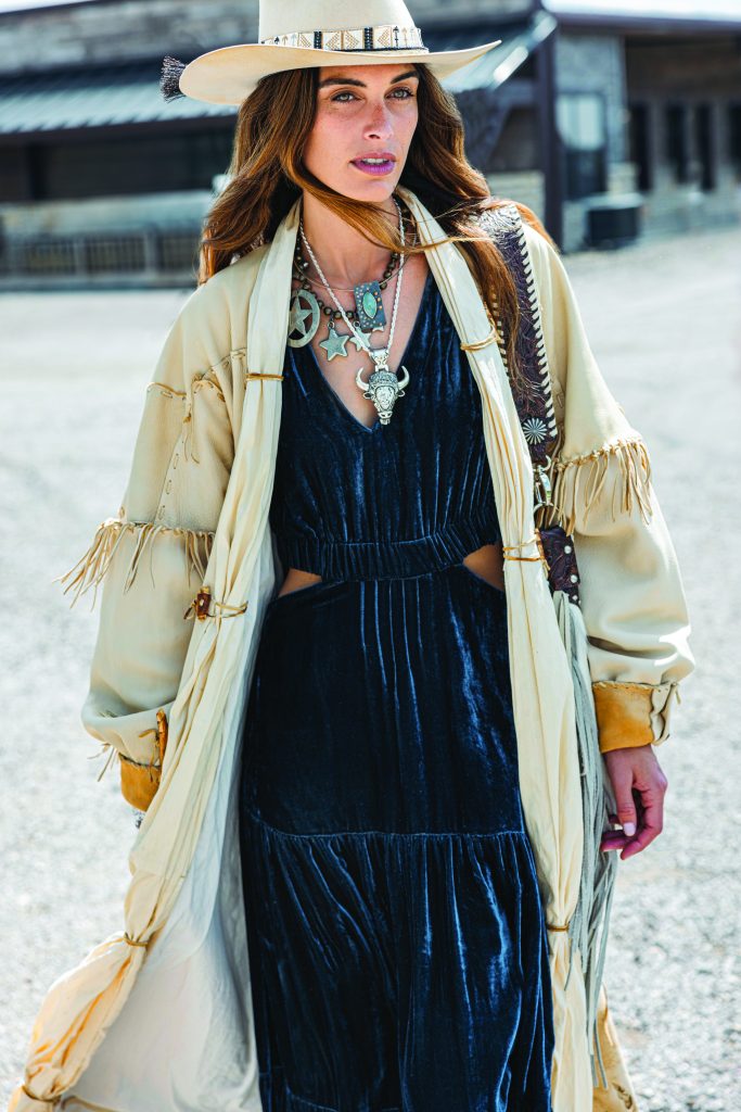 The Legend distressed hat, jwbennett.com; Dried Grass duster, montanadreamwear.com; Eye See necklace, zierjewelry.com; Deep In The Heart necklace, tresmelindas.com; Buffalo necklace, cowboyjewelers.com; Standing Tall Springbox handbag, hmranchstore.com; Coyote Weed dress, doubledranch.com; Wild Horse stone cuff, jewelryladyredriver.com; Emma Jane boots in cognac, laneboots.com.