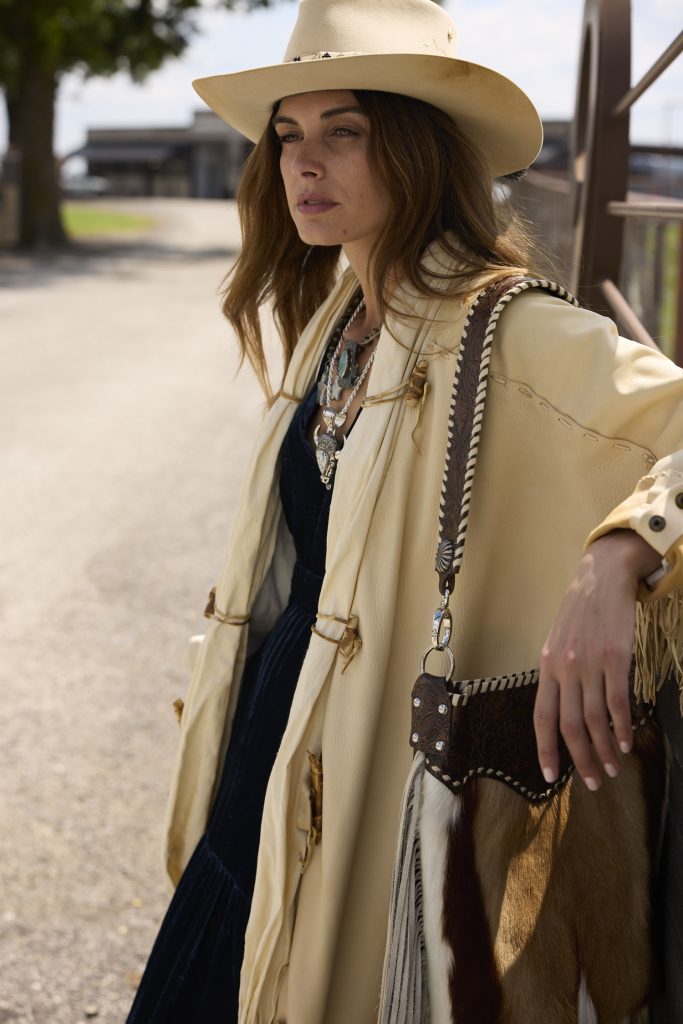 Custom Shorty hat, shortyshattery.com; Kingman Rose earrings, robshermandesigns.com; Mesa choker, denisehagoodstudio.com; Golden and white South Sea pearl necklace, pearlsbyshari.com; Lucky & Blessed Aztec wool overcoat, gomezwesternwear.com; Wynonna pearl snap dress, lovlei.com; Beth Dutton oval turquoise ring, objectsofbeauty.com; Kingman turquoise cuff bracelet, turquoiseandco.com; Braided leather bracelet, belt, buckle, and Rios of Mercedes boots (Lindy’s own).