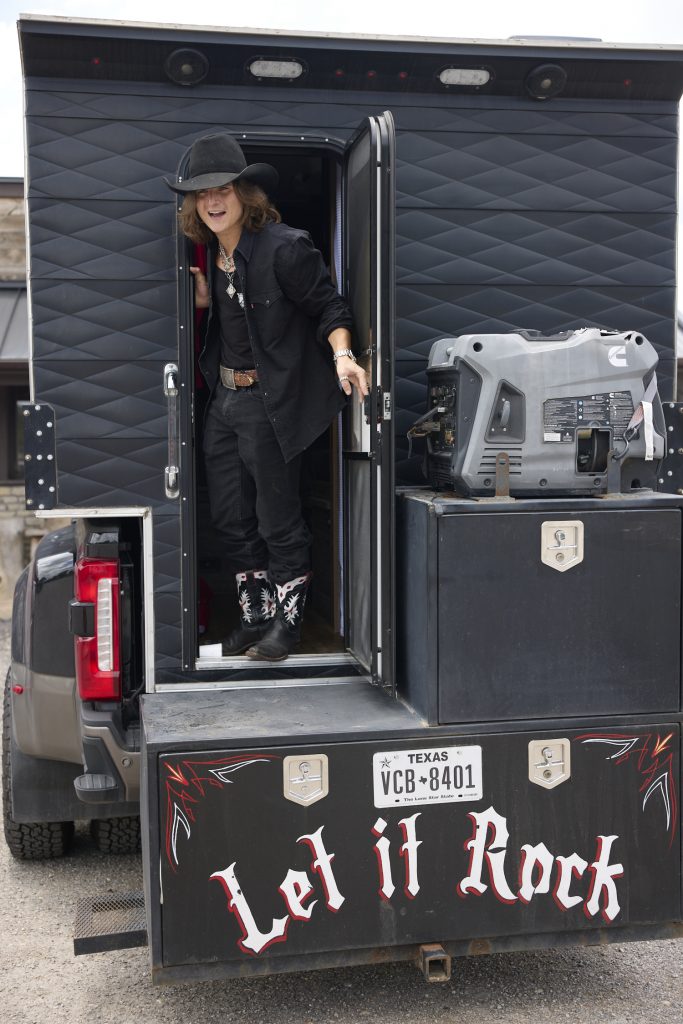 Rank 45 t-shirt and jeans, bootbarn.com; Barstow Western denim shirt in marble black, levi.com; Custom jewelry, rideranksilver.com; Turquoise cuff, hippiecowgirlcouture.com; Custom belt, carmenallen.com; Black felt hat, David Yurman jewelry, belt buckle, and boots (Rocker’s own).