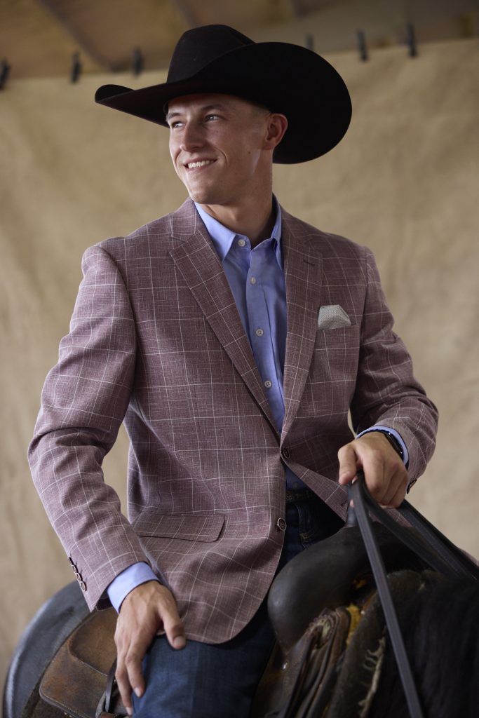 100X felt hat in Black Cherry, shortyshattery.com; Classic pinpoint shirt, schaeferoutfitters.com; Maroon cowboy sports coat, espueladesignco.com; Cinch jeans, Serna boots (Tanguy’s own).