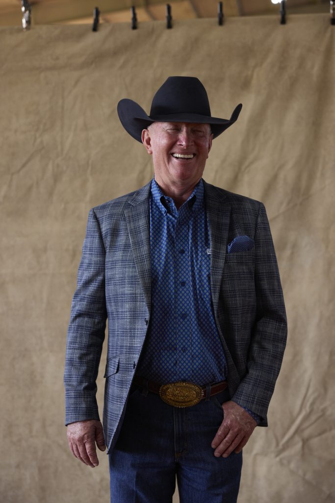 Beaver felt hat in denim, westernlegacyco.com; Gray plaid cowboy sports coat, espueladesignco.com; Blue button-down shirt and jeans, cinchjeans.com; Irona Howe (Lakota) belt, Instagram: @ironalee; Rod Patrick boots (Winston’s own).