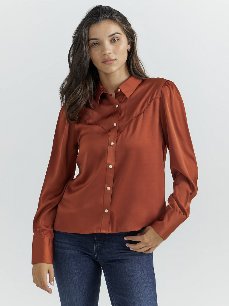 Lake Tahoe satin shirt, hbarc.com; Stretch satin embroidered button-up, cowgirltuff.com; Satin Rodeo blouse, wrangler.com.