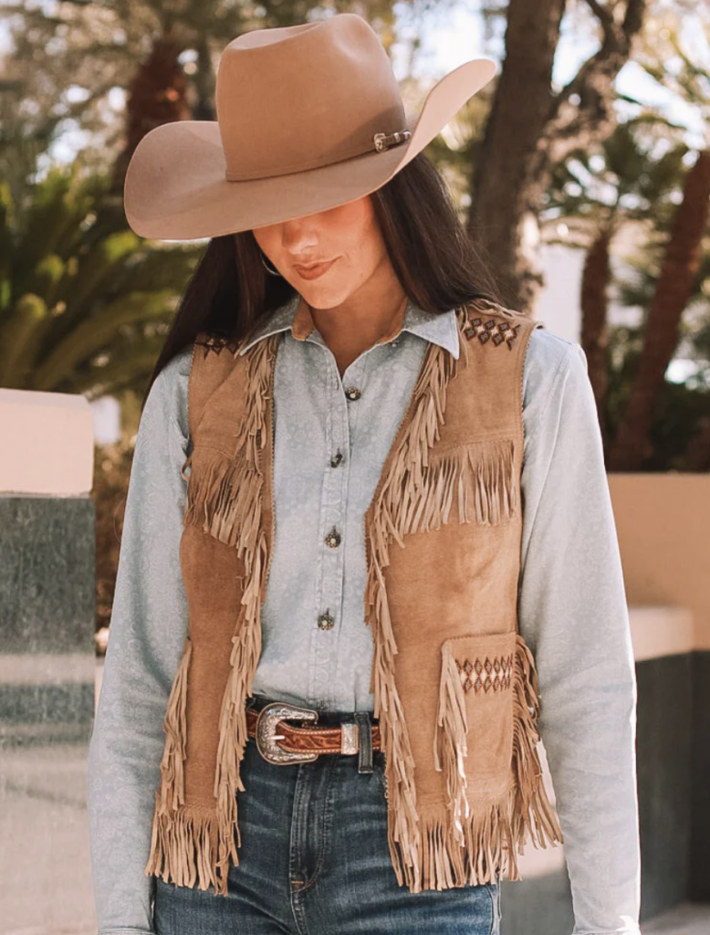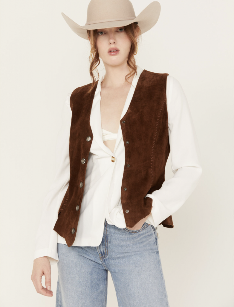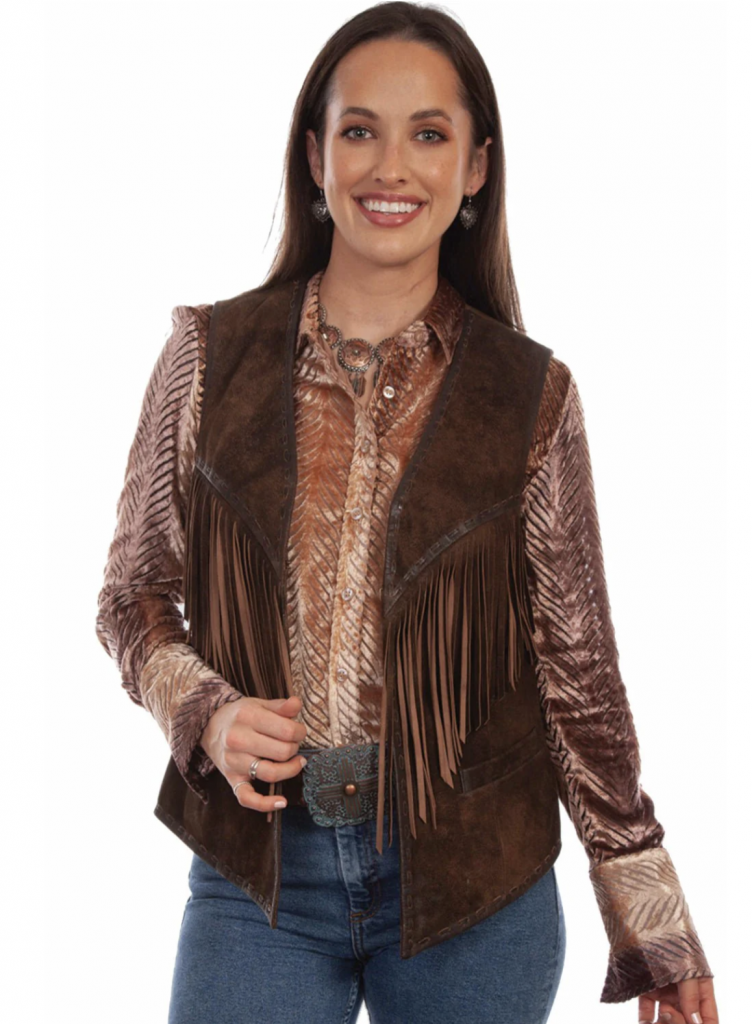 Scully leather fringe vest, thewesterncompany.com; Anna leather fringe vest, madisoncreekoutfitters.com; Scully suede snap front vest, countryoutfitter.com.