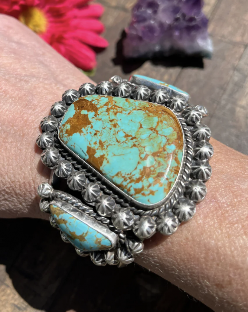 Ronald Tom Royston turquoise cuff, coloradojo.com; 3 stone Kingman cuff, hippiecowgirlcouture.com; Shyanne Roaming West cuff, bootbarn.com.