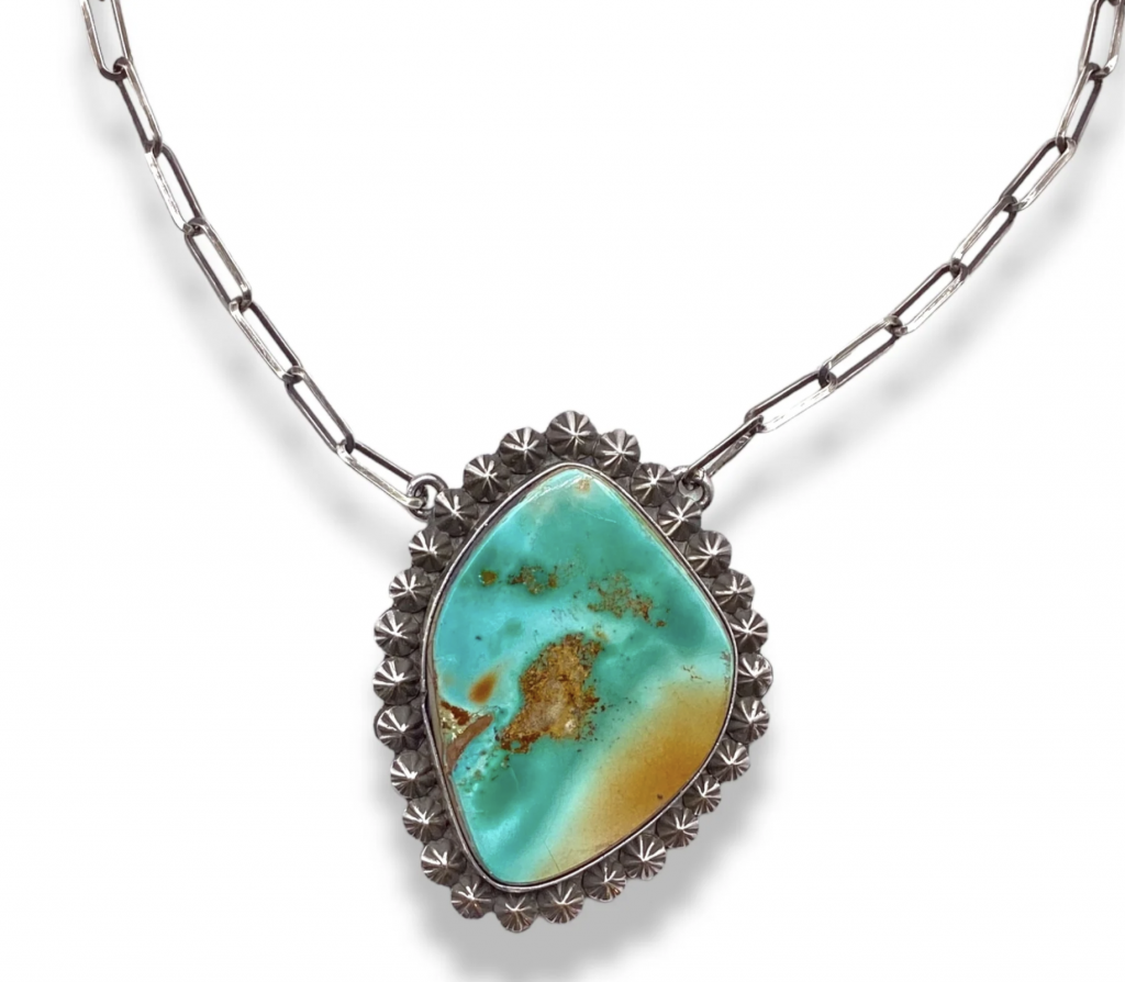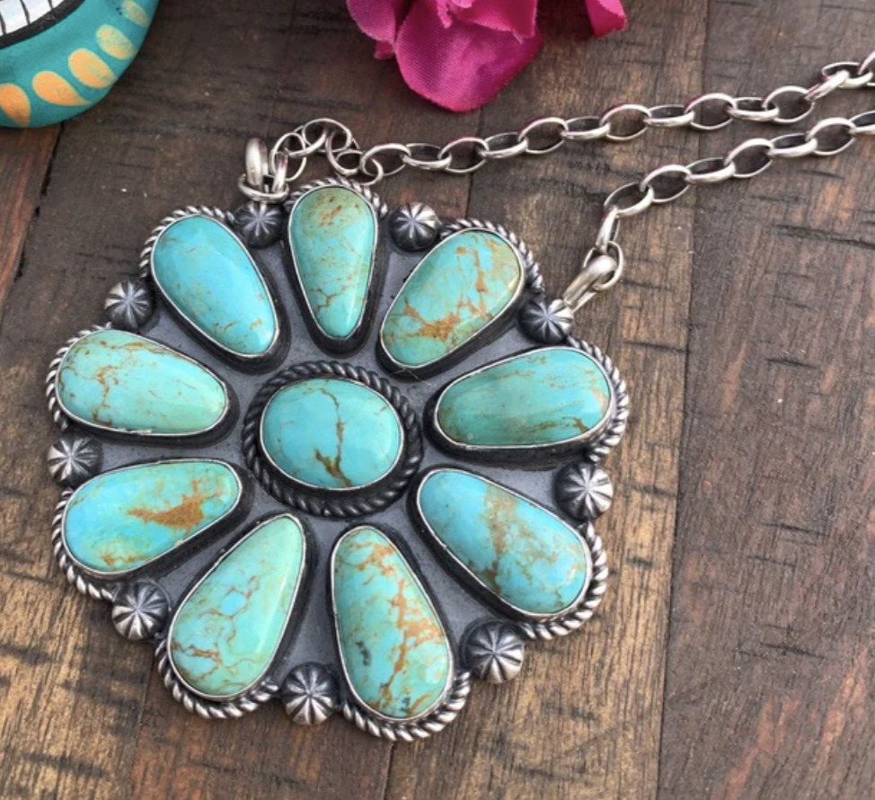 Clarrisa Hale (Navajo) Mixed turquoise cluster pendant, coloradojo.com; Leigh Cleveland (Navajo) Royston turquoise star statement necklace, lanterndancer.com; The Kingman Blossoming necklace, hippiecowgirlcouture.com.