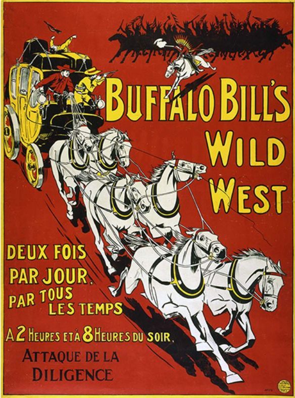 Delaney: Buffalo Bill’s Wild West advertising posters introduced William F. “Buffalo Bill” Cody, the Native American Indian performers, sharpshooters like Annie Oakley and Johnny Baker, and the military equestrians of the Congress of Rough Riders of the World, to cities and towns across the United States and Europe in advance of the tour stops. Wild West program annual favorite segments, like Attack on the Deadwood Stagecoach and Custer’s Last Stand, were depicted on the promotional posters and in Wild West program books. The poster imagery glorified the achievements of Buffalo Bill Cody and the romanticism of the myths of the American West and frontier life, the vanishing buffalo, and stereotypical depictions of American Indians as the enemy of the U.S. military and scouts like Cody. Some American Indian performers in the Wild West may have actually participated in the historic battles being played out in the Wild West arena performances.