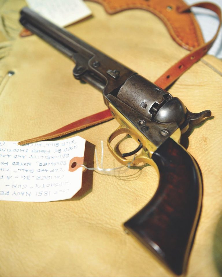Left: A cup emblazoned with the character Hipshot was among Lynde memorabilia donated to the Montana Historical Society. Right: A Colt 1851 Navy revolver used by Wild Bill Hickok was comic-strip character Hipshot’s gun. Lynde wore these chaps (shown under the revolver)— which have his registered brand, RIK, on the hip—during the Great Montana Centennial Cattle Drive in 1989.