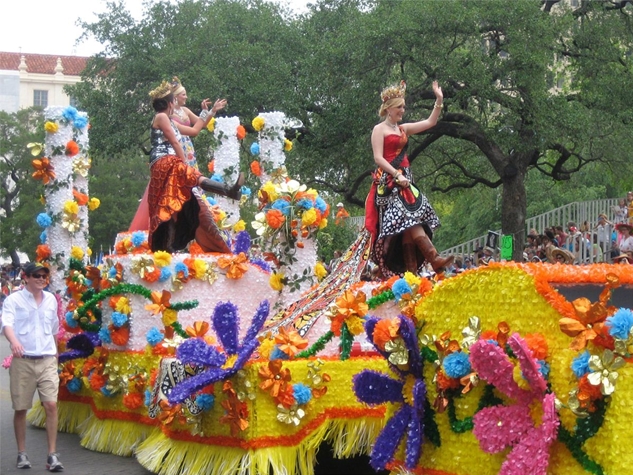 The parade will feature spectacular flower-covered floats with riders in colorful costumes, beautiful dresses and striking uniforms. Participants include local civic and military groups, businesses and members of the Fiesta royalty. Giant helium balloons, beautifully decorated, horse-drawn carriages and antique cars, along with uniformed cavalcades performing their routines, will thrill parade goers.
