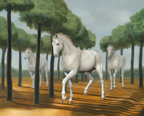In this exhibition Kelly brings forward the entirety of the figurative elements and spatial structures in his paintings to create images with multiple perceptual points of view; where all the components play a fundamental role in the overall composition. The paintings feature familiar subjects from the artist’s visual vernacular, notably horses, cows, and lions. But beyond the usual romantic depictions in art in which animals are represented as pets or as exotic beasts, Kelly uses animals as allegorical proxies for human affairs. They also function as purely compositional elements selected for their shape, mass, line, color, etc. to express feelings that speak nonverbally to the viewer’s emotions. The overall construction creates a structural choreography that borrows shapes from the neighboring objects in the painting to produce secondary and tertiary abstracted structures, executed with simplicity and a touch of musicality.